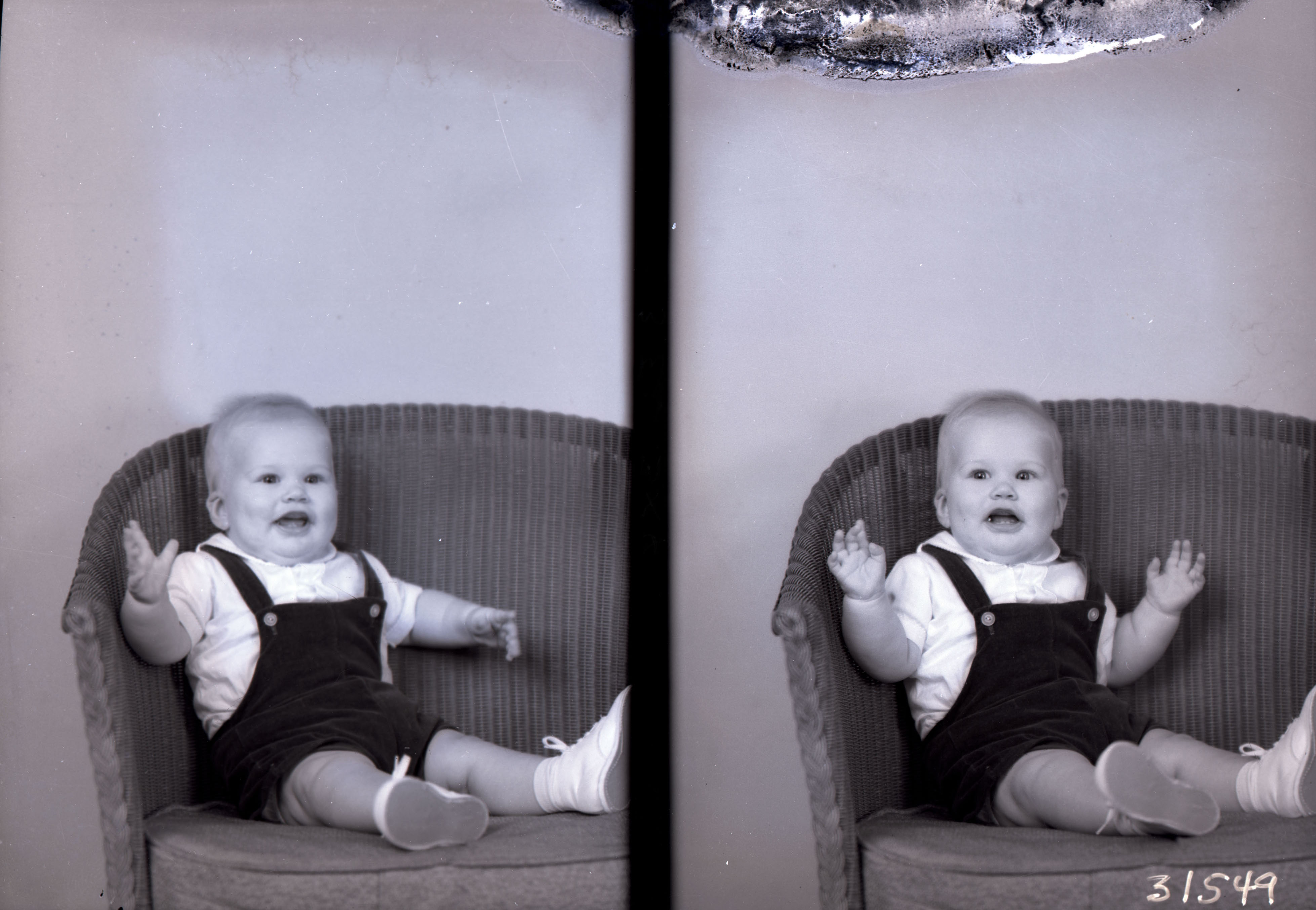 Photo of two separate photographs of the same unidentified young boy in short overalls and seated on a chair.