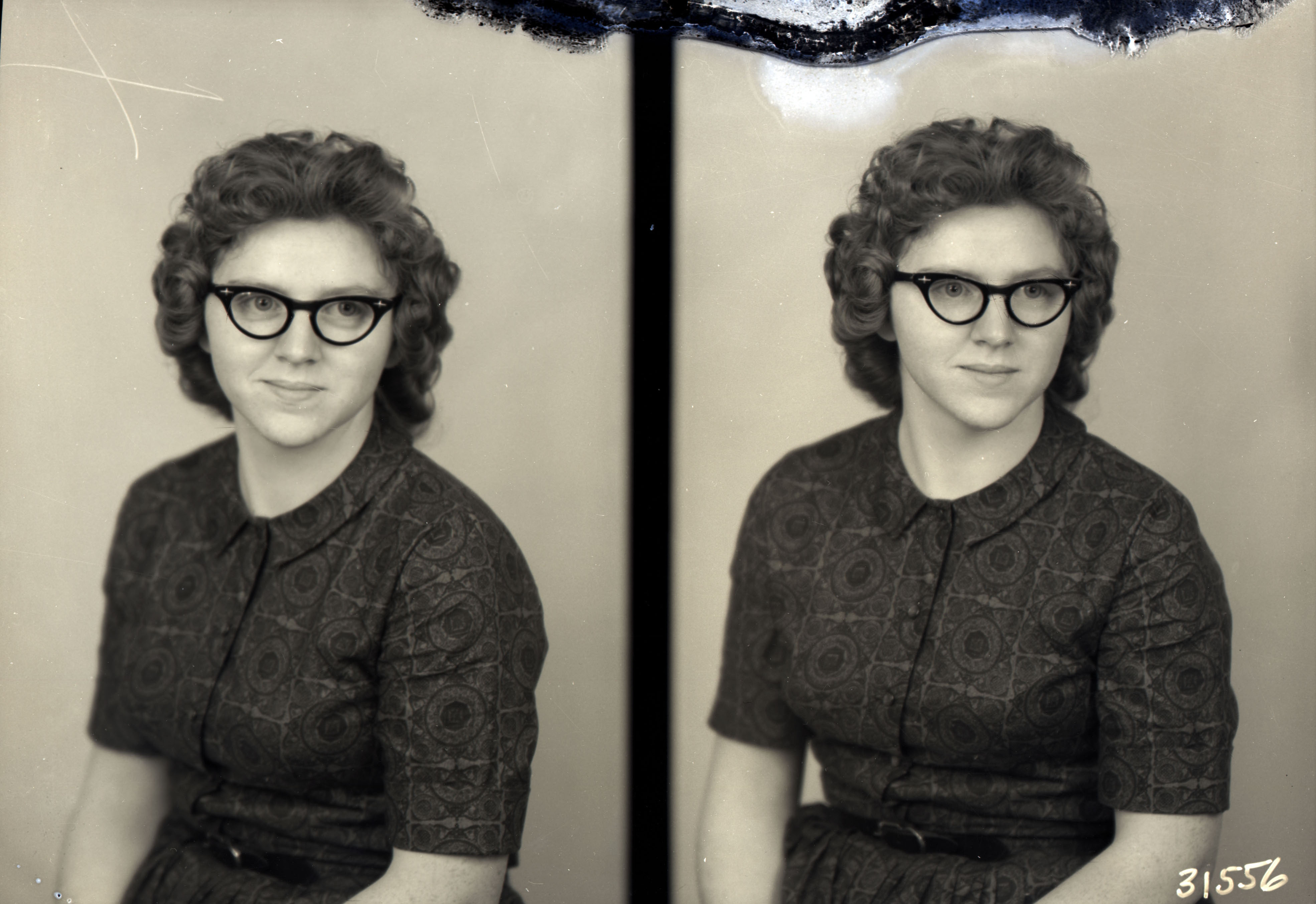 Photo of two separate portrait photographs of the same unidentified woman with glasses, short curly hair, and wearing a short-sleeved, print dress.
