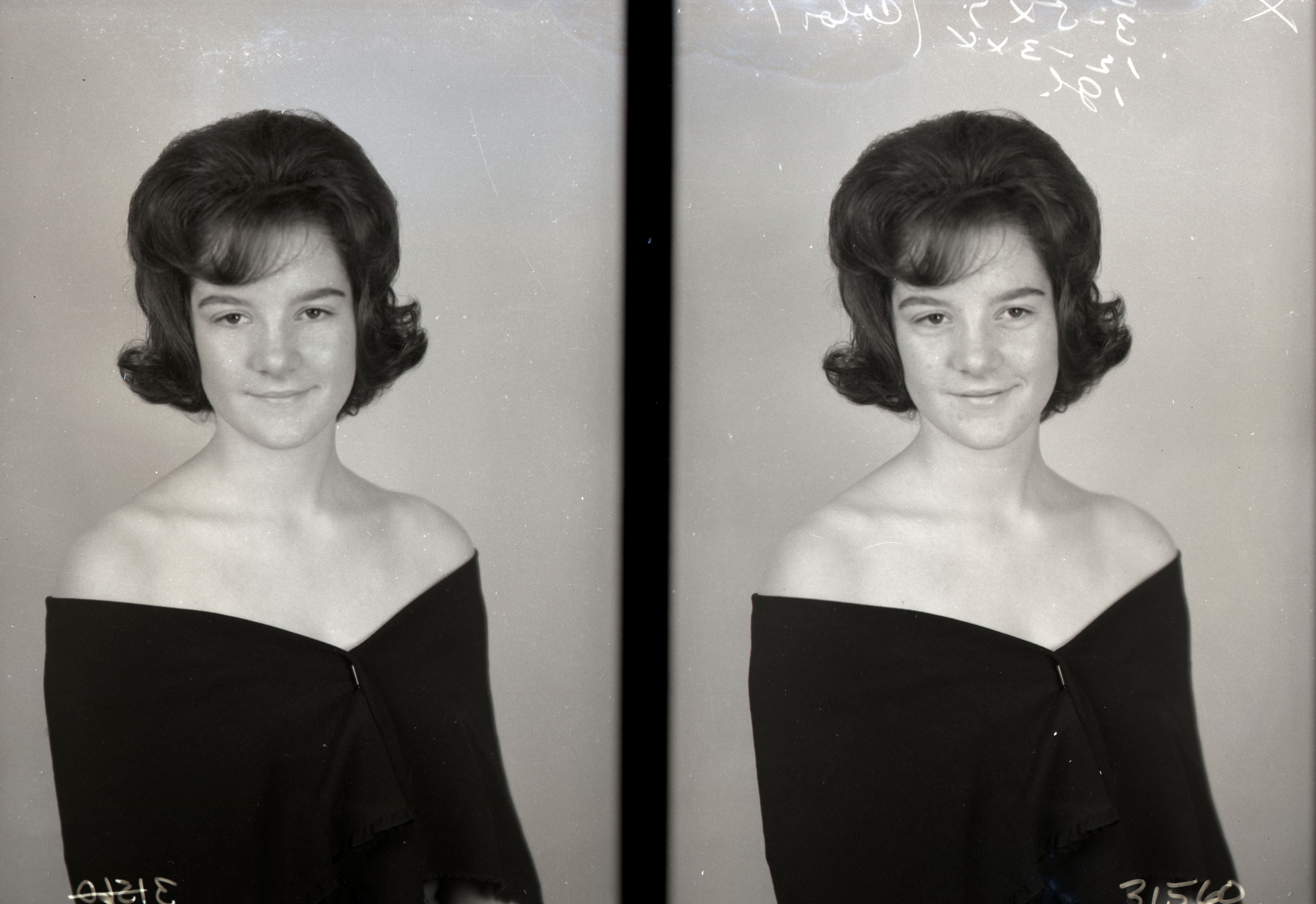 Photo of two separate portrait photographs of the same unidentified young woman with short, styled hair and wearing a photographer's drape.