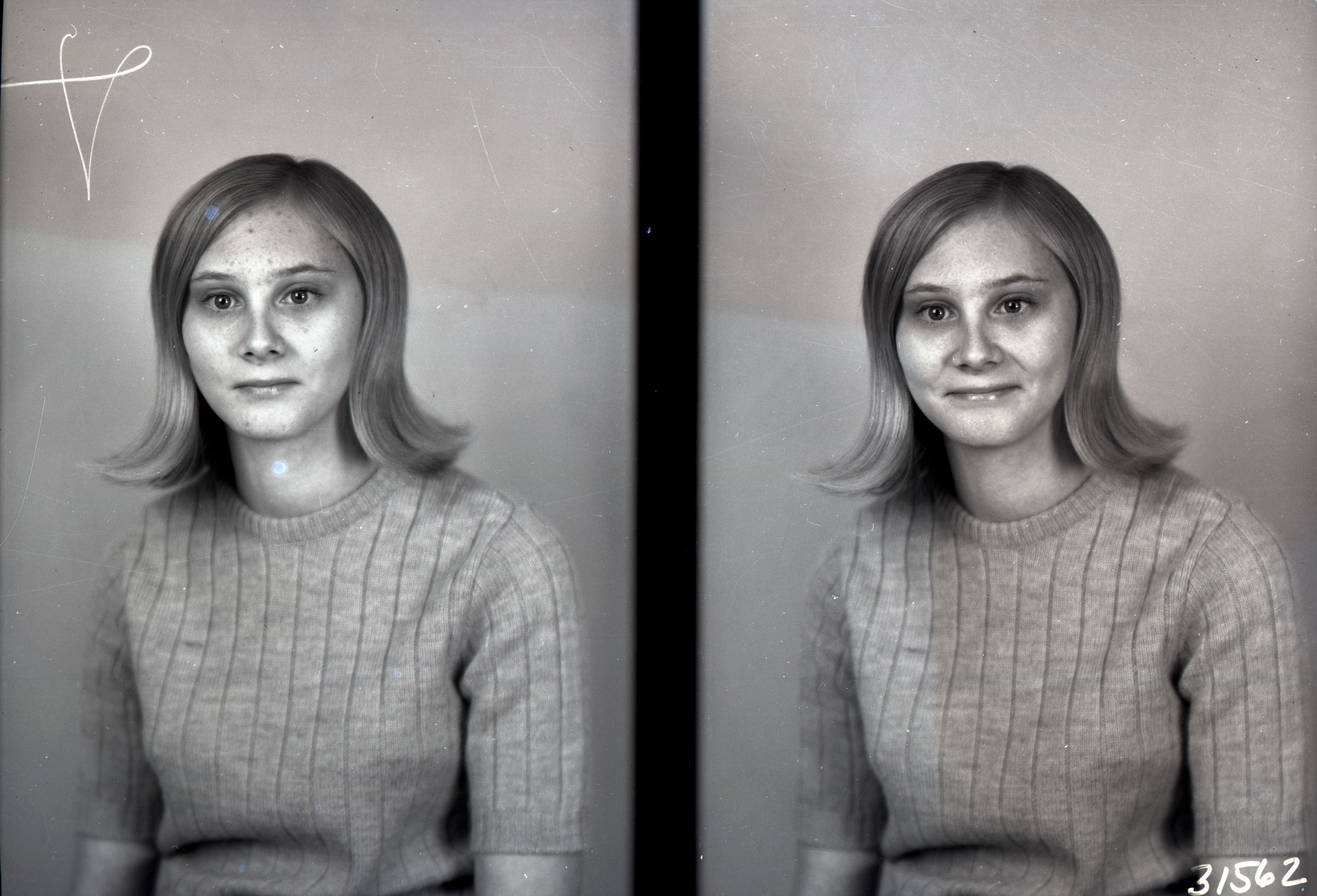 Photo of two separate portrait photographs of the same unidentified young woman with shoulder length straight hair and wearing a short-sleeved top.