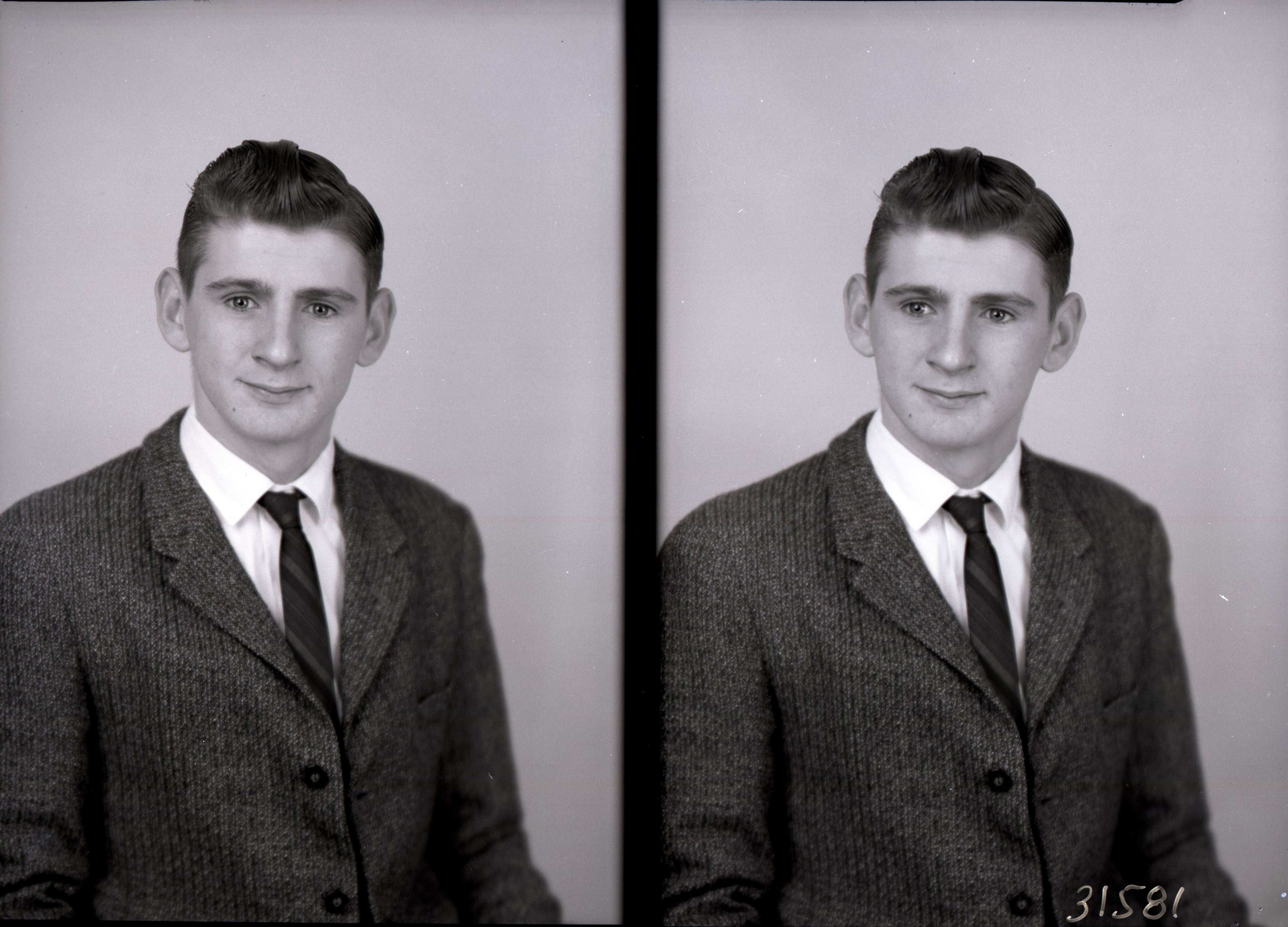Photo of two separate portrait photographs of the same unidentified young man in a suit and tie.