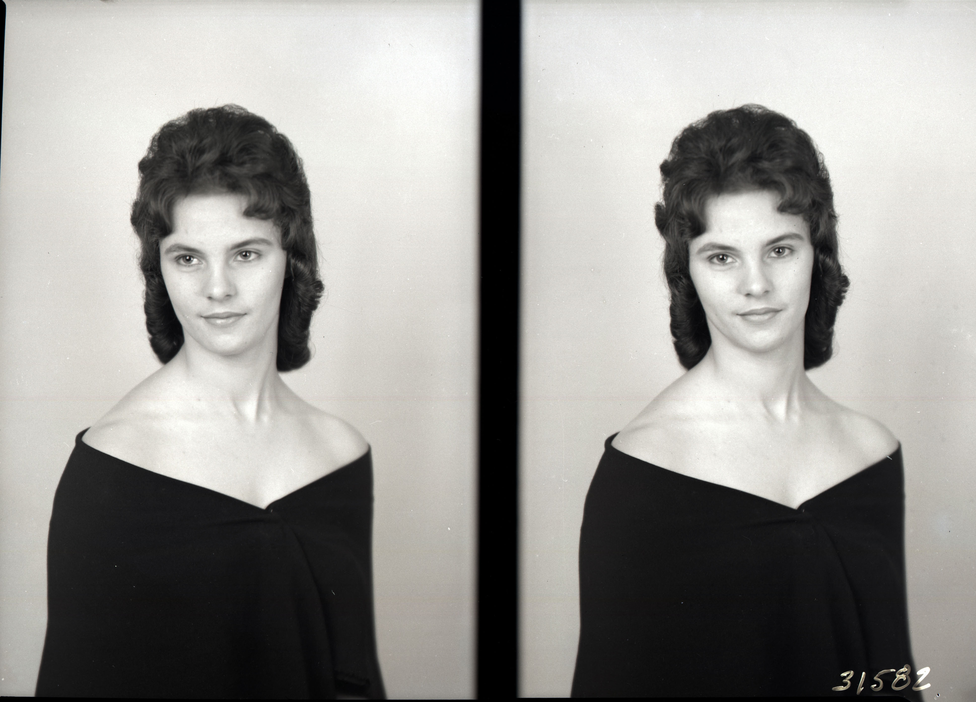 Photo of two separate portrait photographs of the same unidentified young woman with short, styled hair and wearing a photographer's drape.