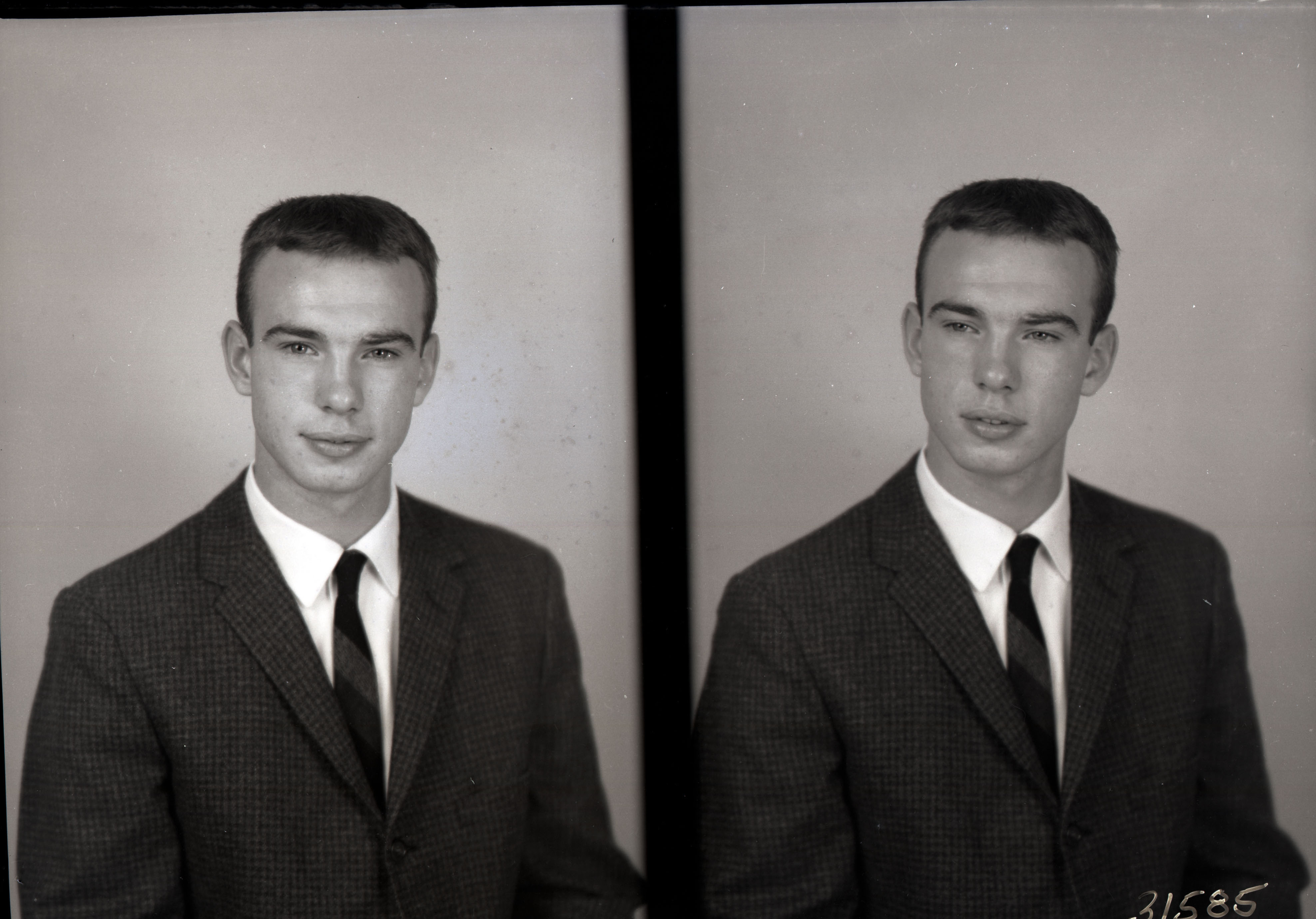 Photo of two separate portrait photographs of the same unidentified young man in a suit and tie.