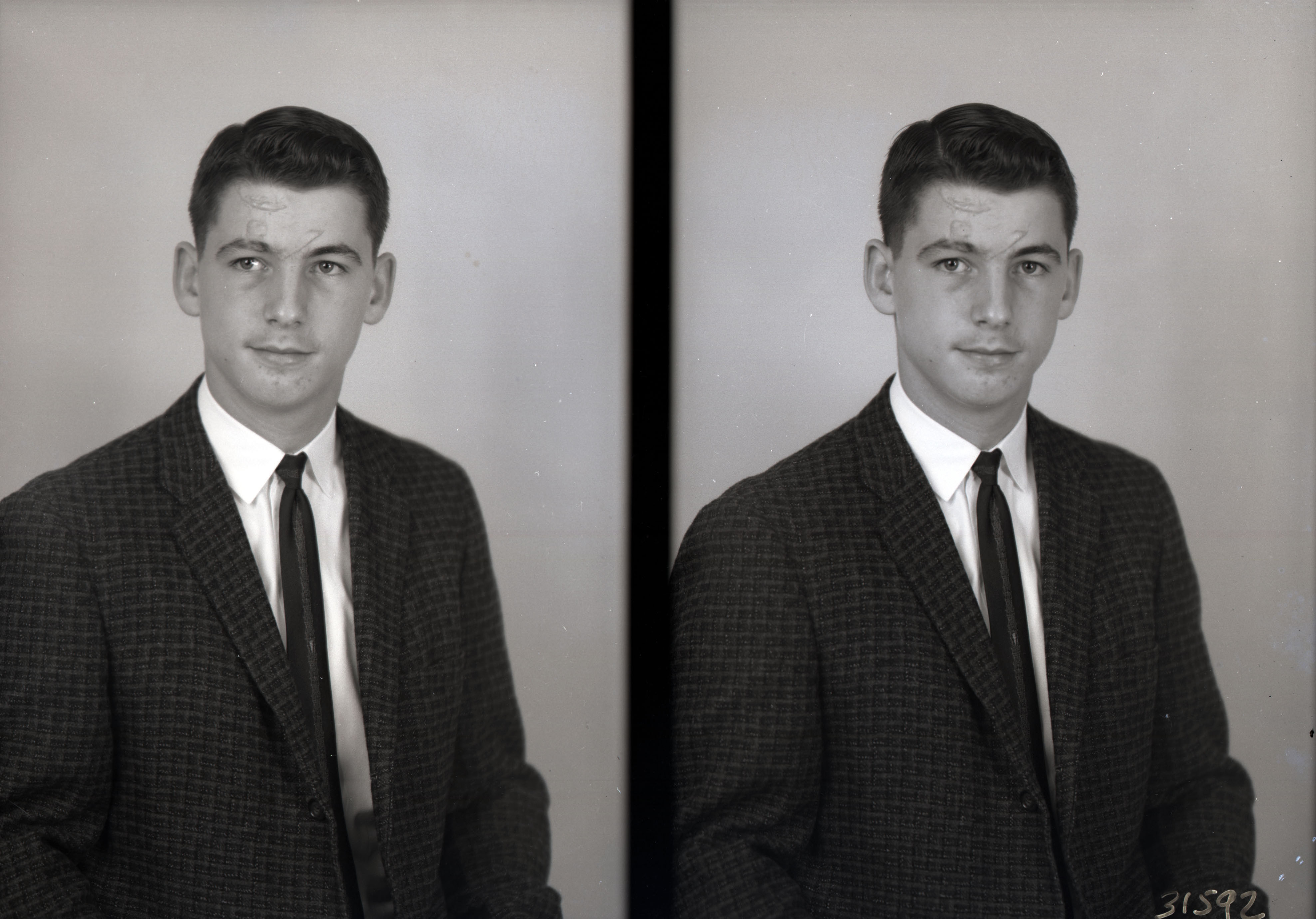 Photo of two separate portrait photographs of the same unidentified young man in a suit and tie.