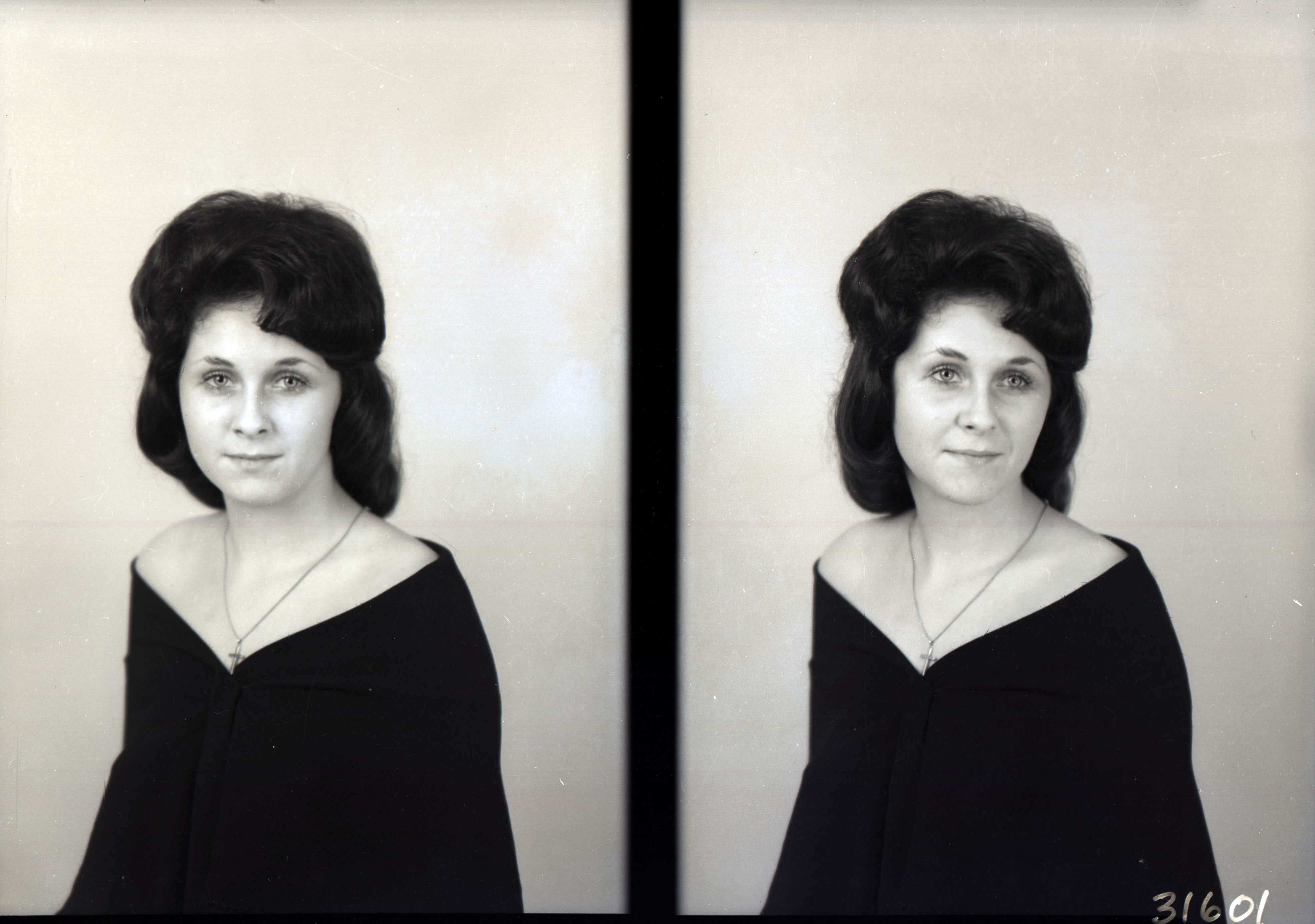 Photo of two separate portrait photographs of the same unidentified young woman wearing a necklace and a photographer's drape.