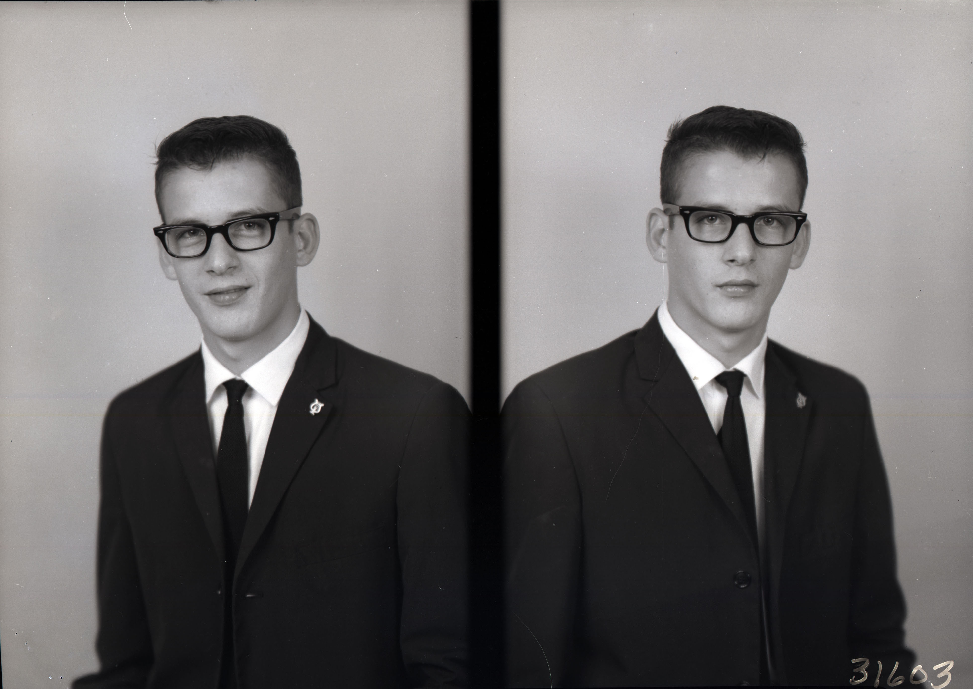 Photo of two separate portrait photographs of the same unidentified young man with glasses and wearing a suit and tie.