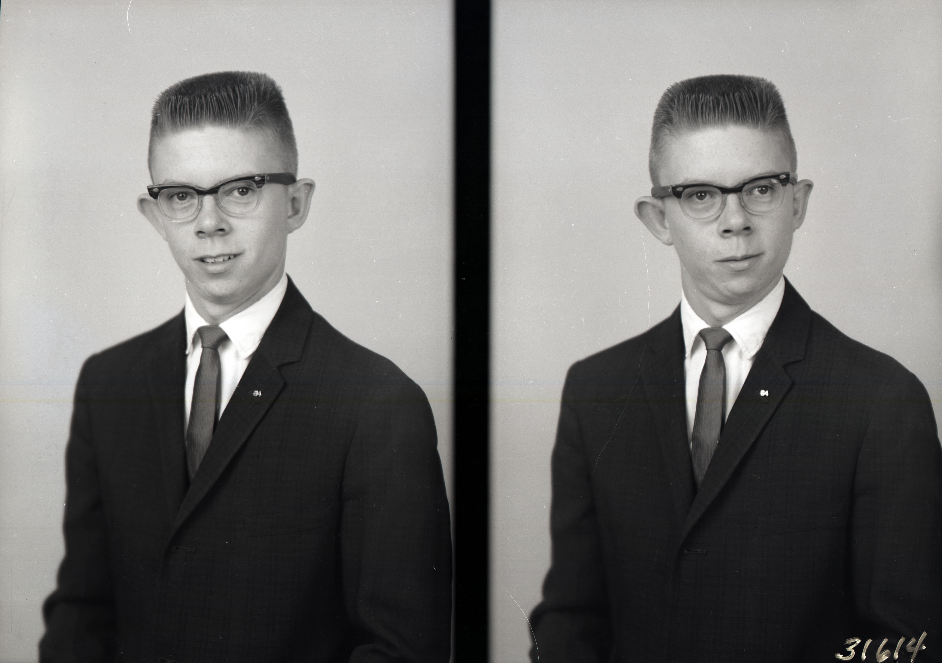Photo of two separate portrait photographs of the same unidentified young man with glasses and wearing a suit and tie.