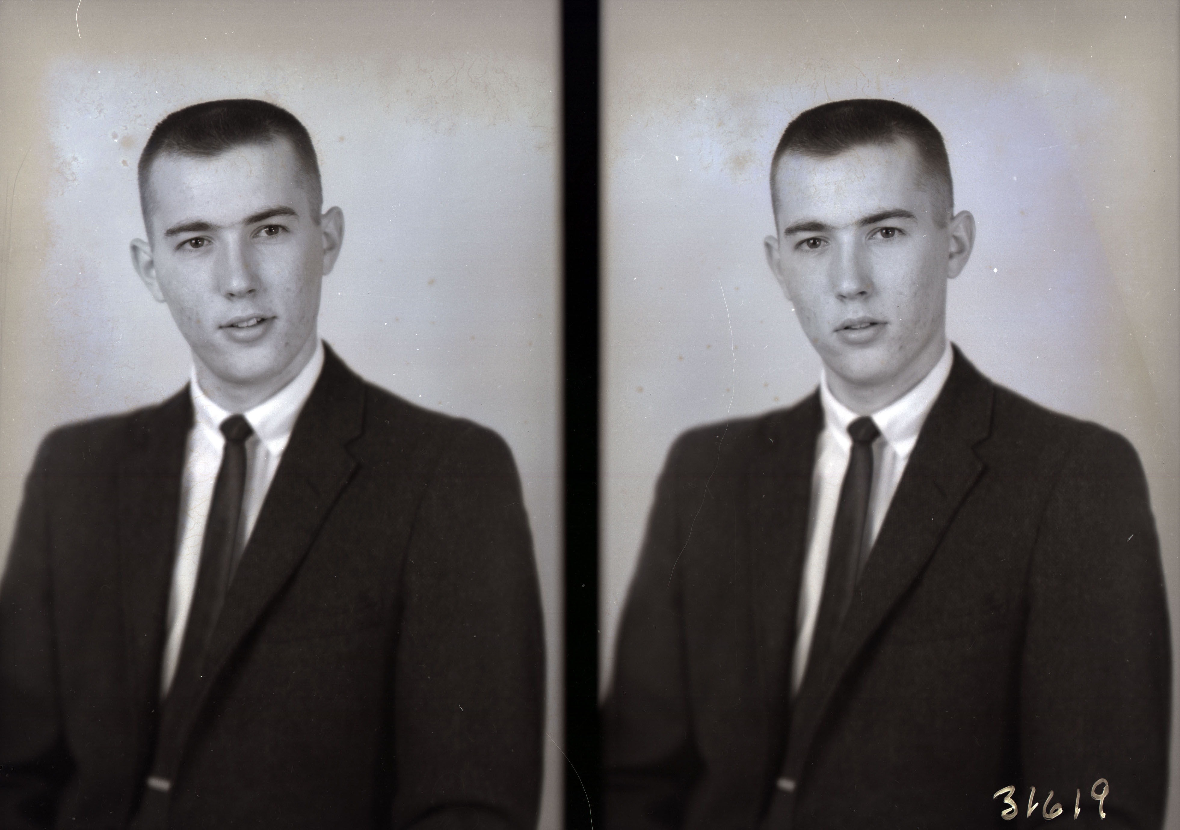 Photo of two separate portrait photographs of the same unidentified young man in a suit and tie.