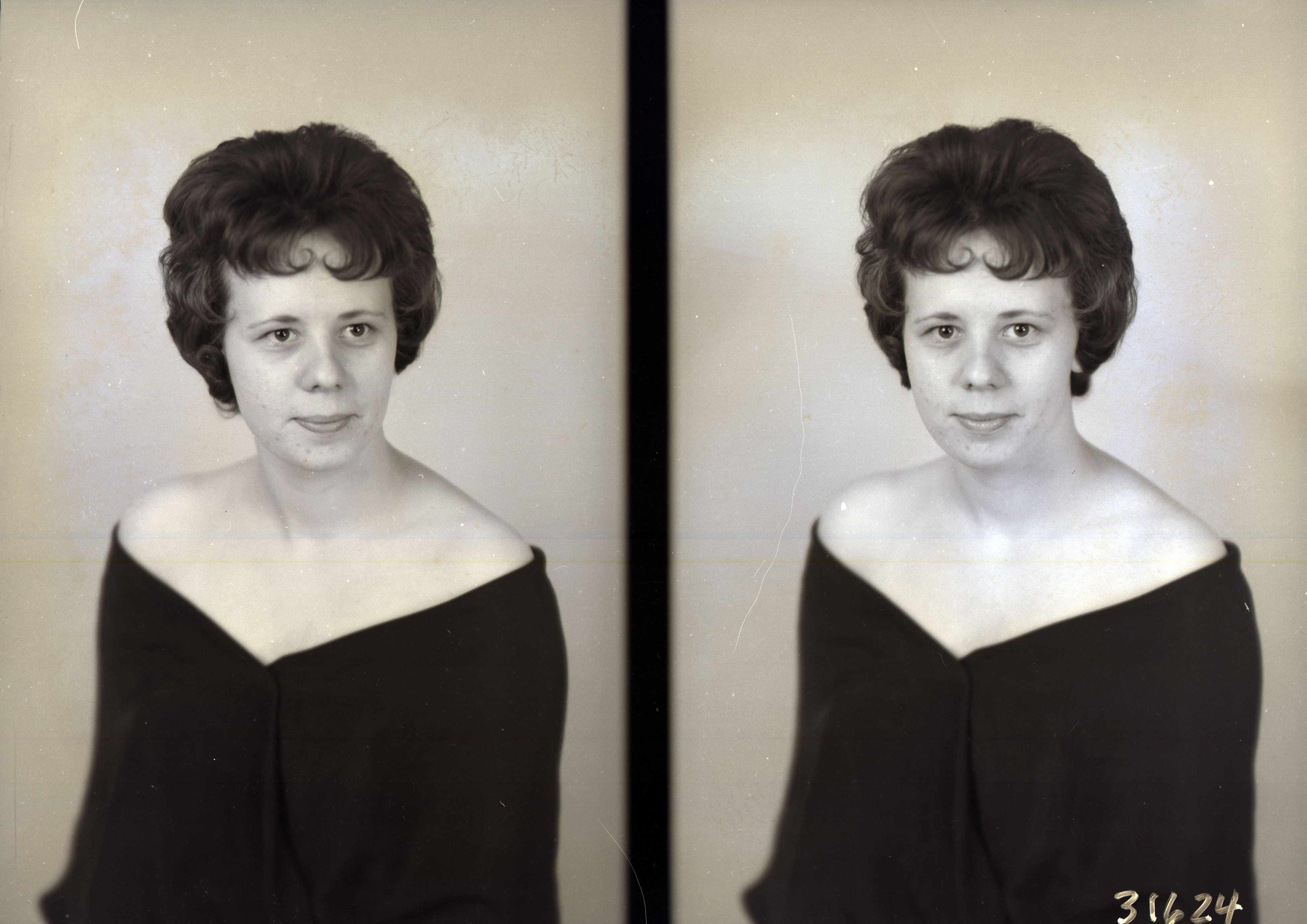 Photo of two separate portrait photographs of the same unidentified young woman with short, styled hair and wearing a photographer's drape.