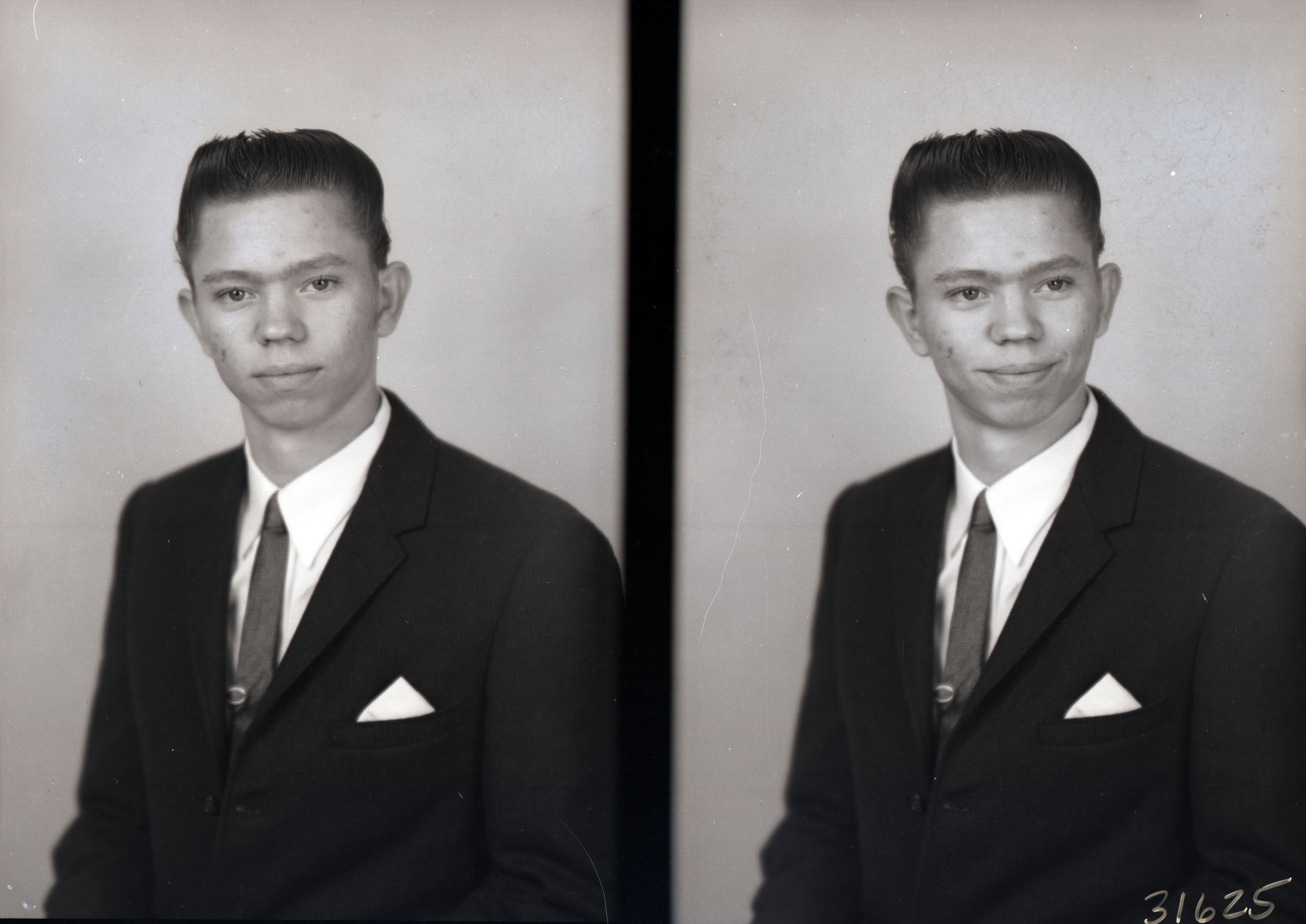 Photo of two separate portrait photographs of the same unidentified young man in a suit and tie.