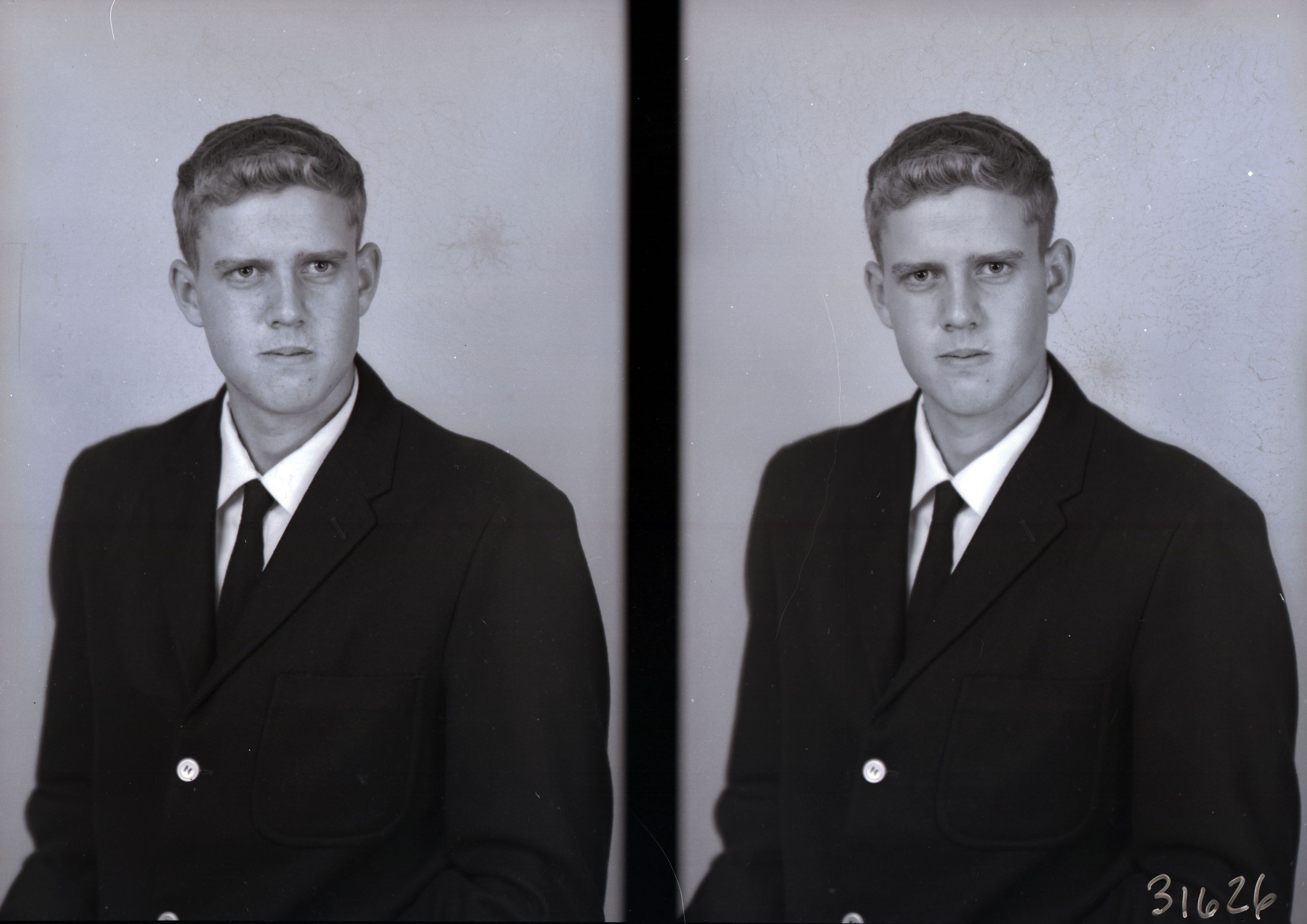 Photo of two separate portrait photographs of the same unidentified young man in a suit and tie.