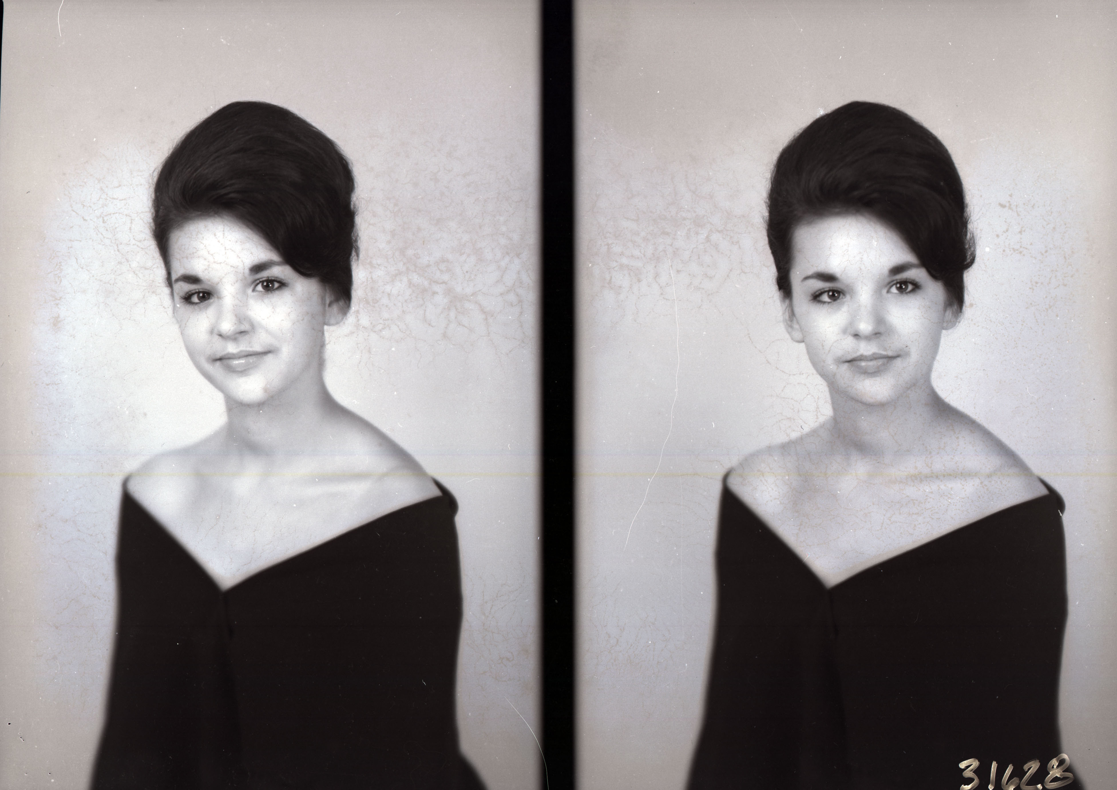 Photo of two separate portrait photographs of the same unidentified young woman with short, styled hair and wearing a photographer's drape.