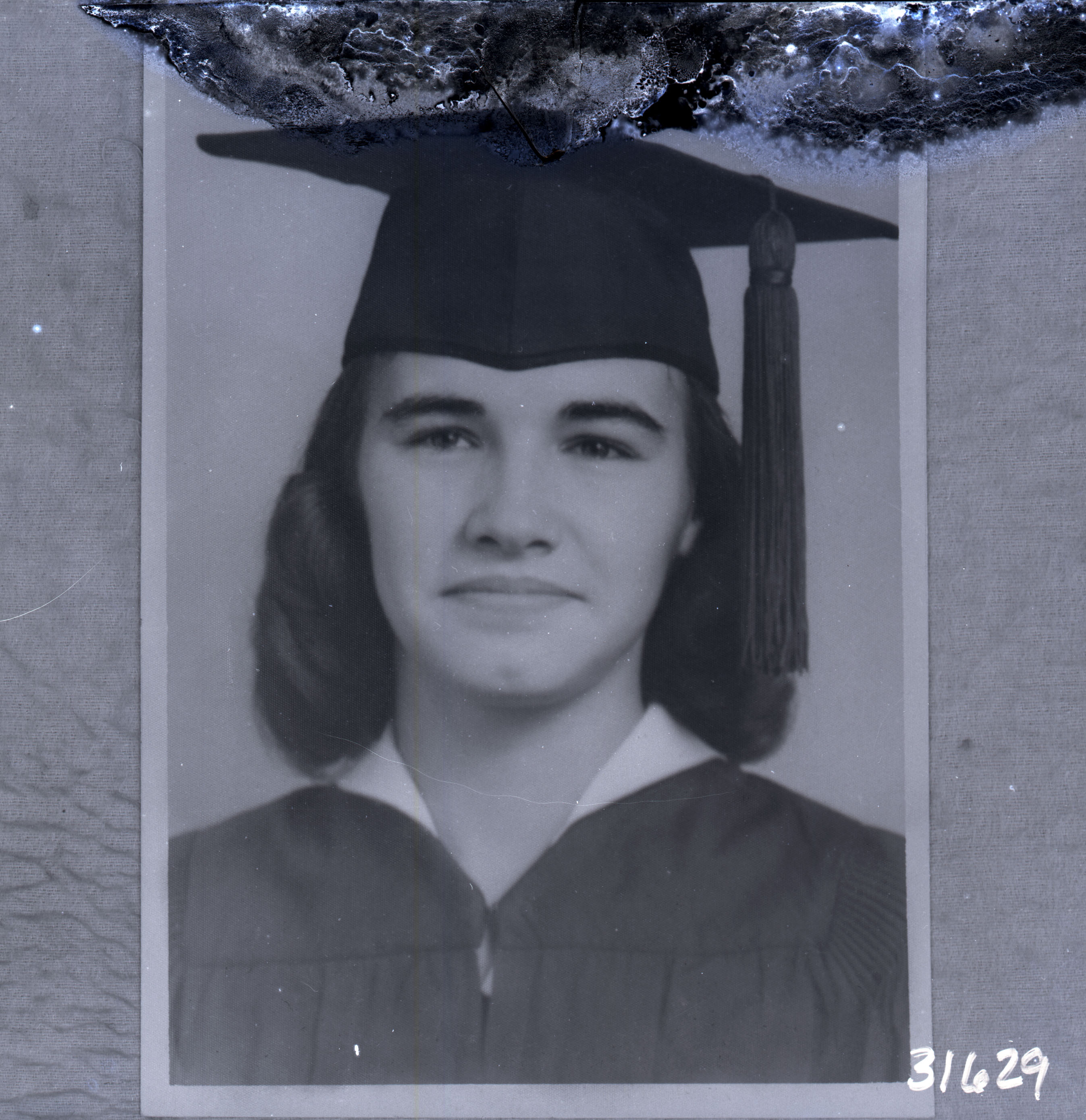 Photo of a portrait photograph of an unidentified young woman wearing her graduation cap and gown.