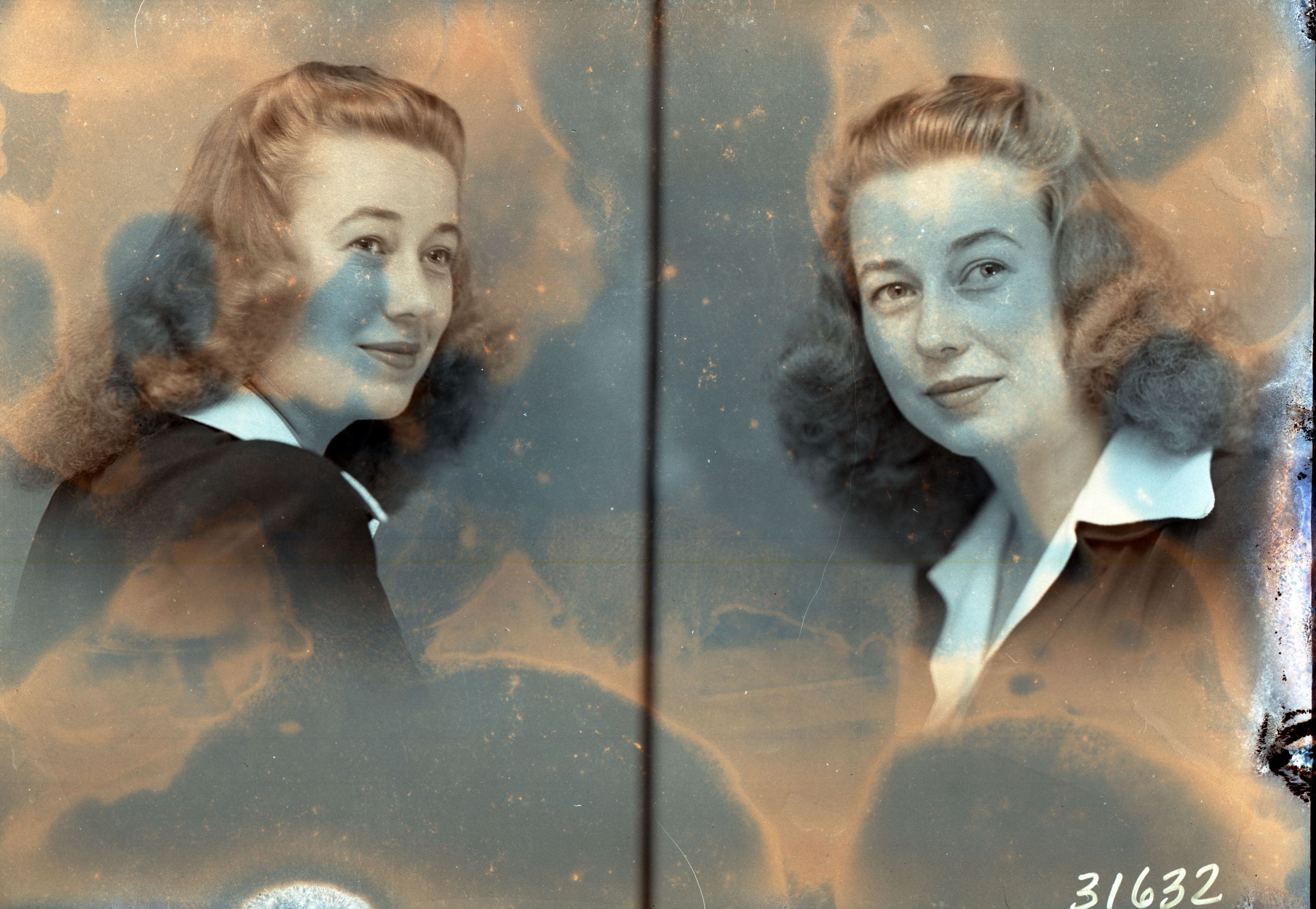 Photo of two separate portrait photographs of the same unidentified young woman with shoulder-length hair.