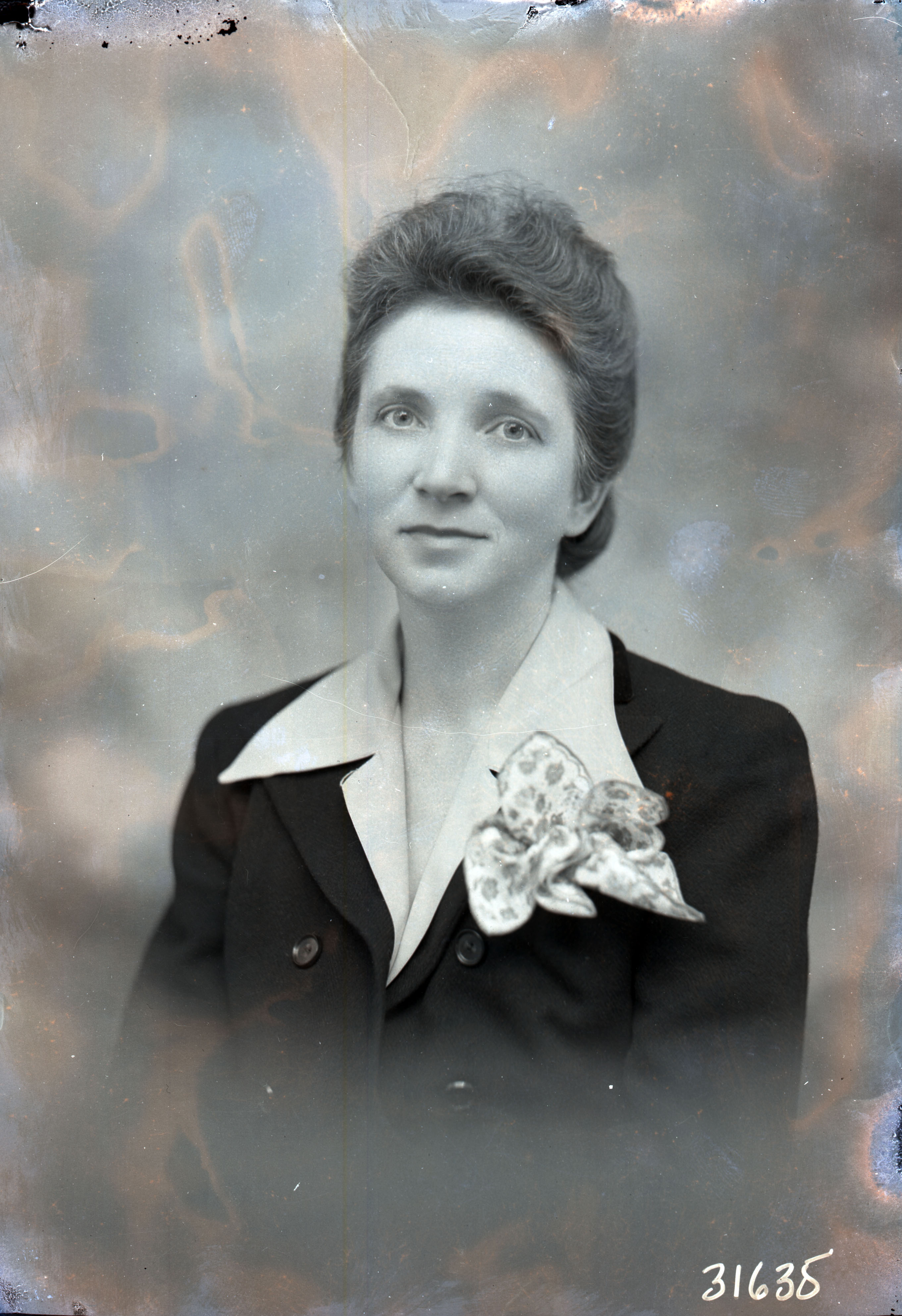 Portrait photograph of an unidentified woman with a corsage pinned to the collar of her blouse.
