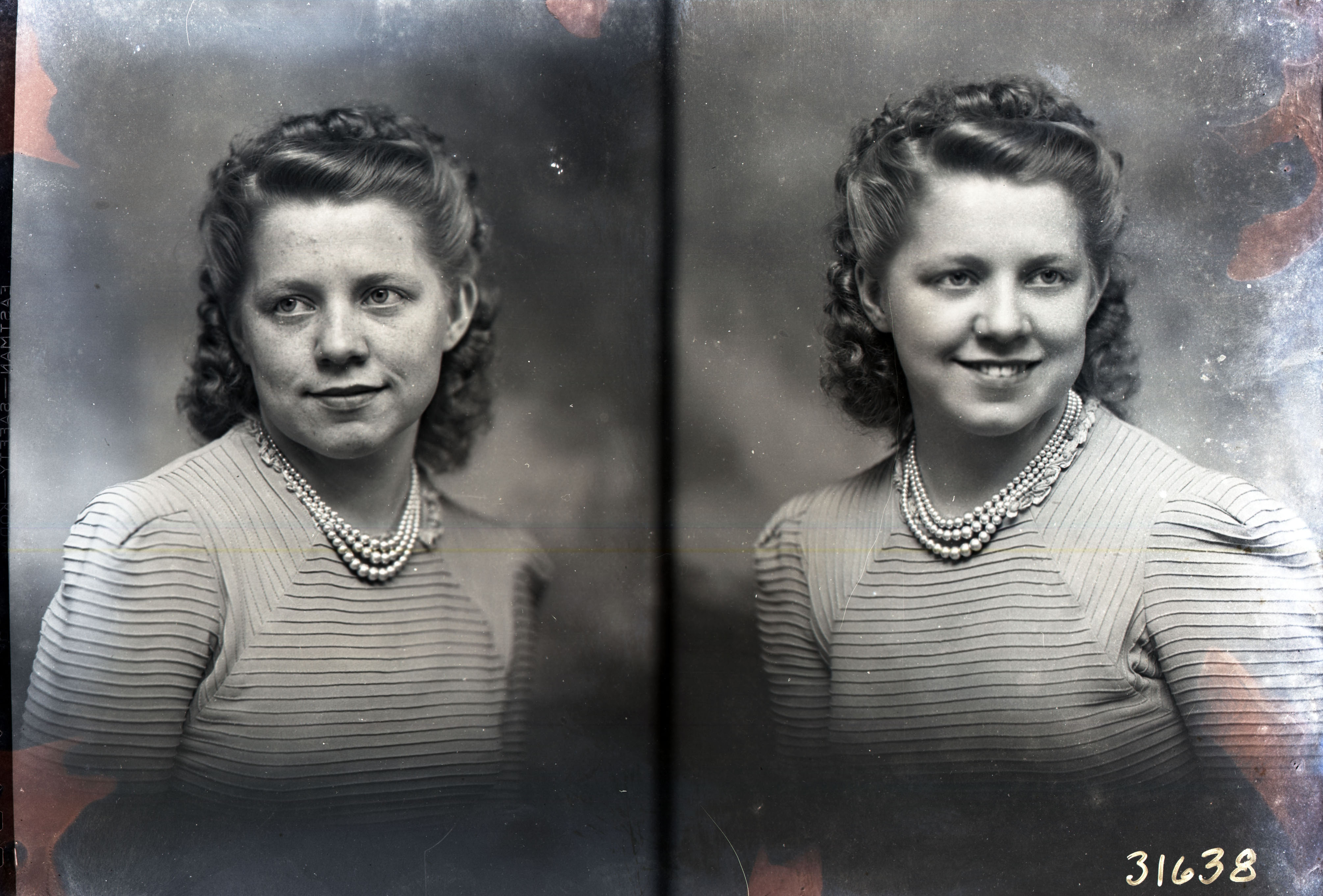Photo of two separate portrait photographs of the same unidentified woman with short curled hair and wearing a three-strand faux pearl necklace with her dress.