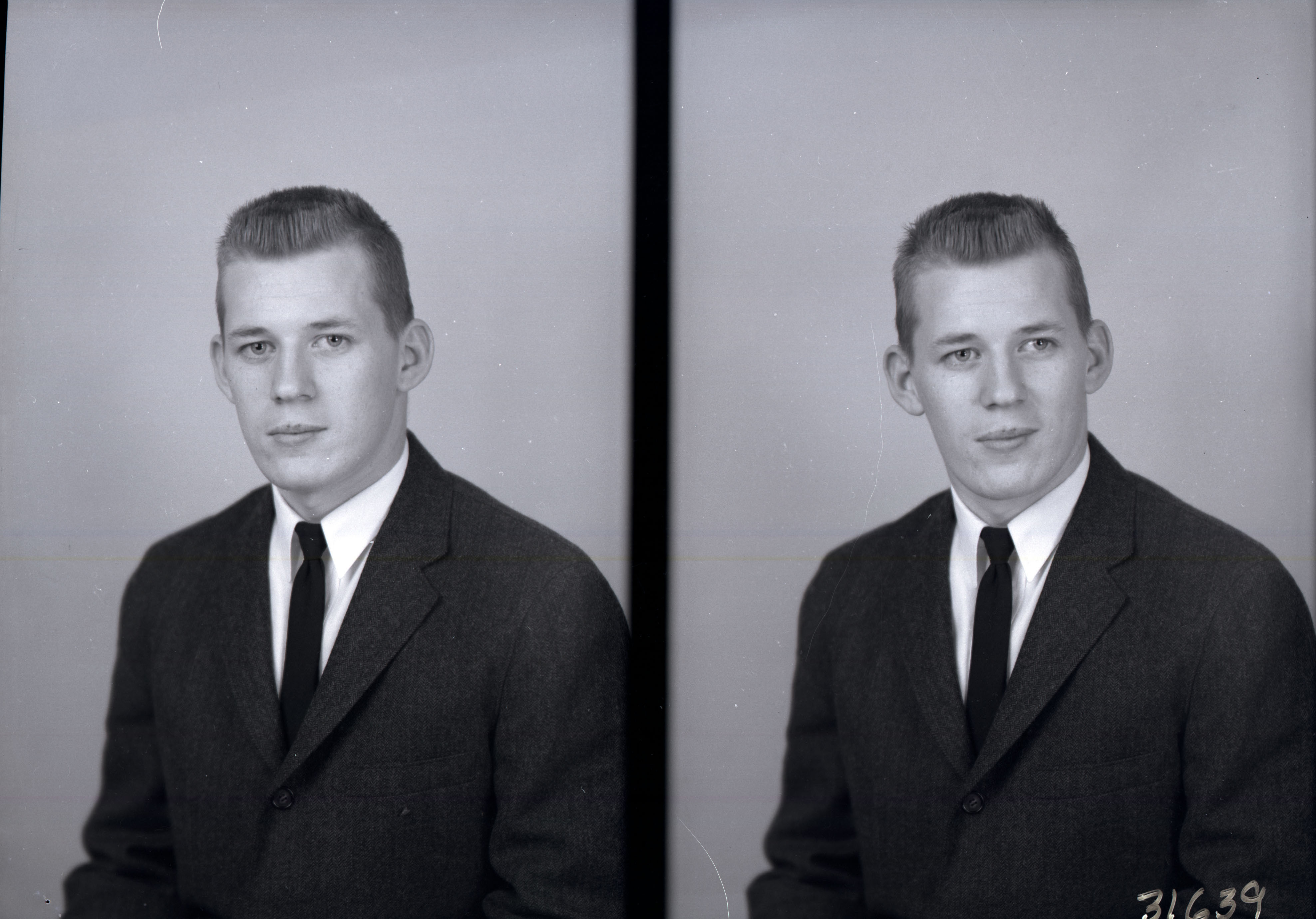 Photo of two separate portrait photographs of the same unidentified young man in a suit and tie.