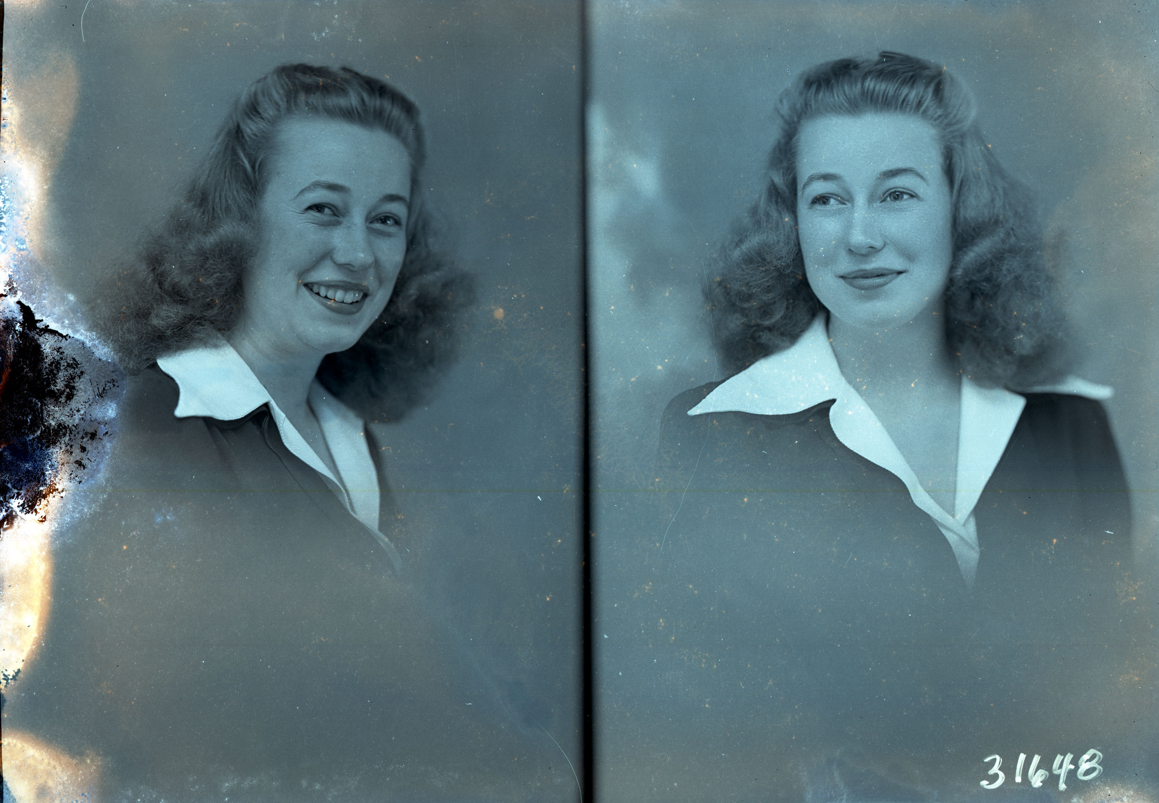 Photo of two separate portrait photographs of the same unidentified woman with shoulder-length hair and wearing a wide collared blouse under a jacket.