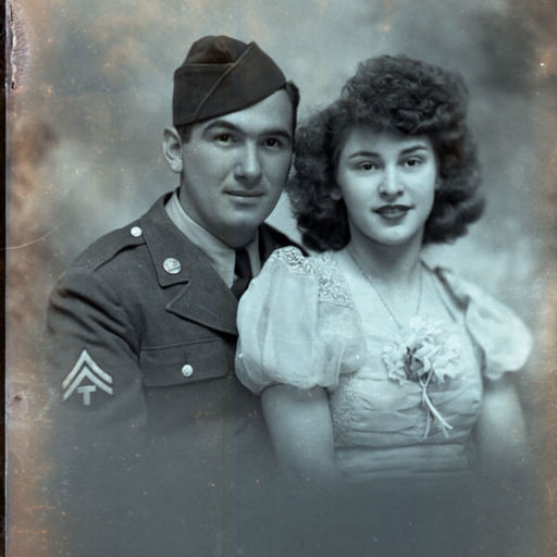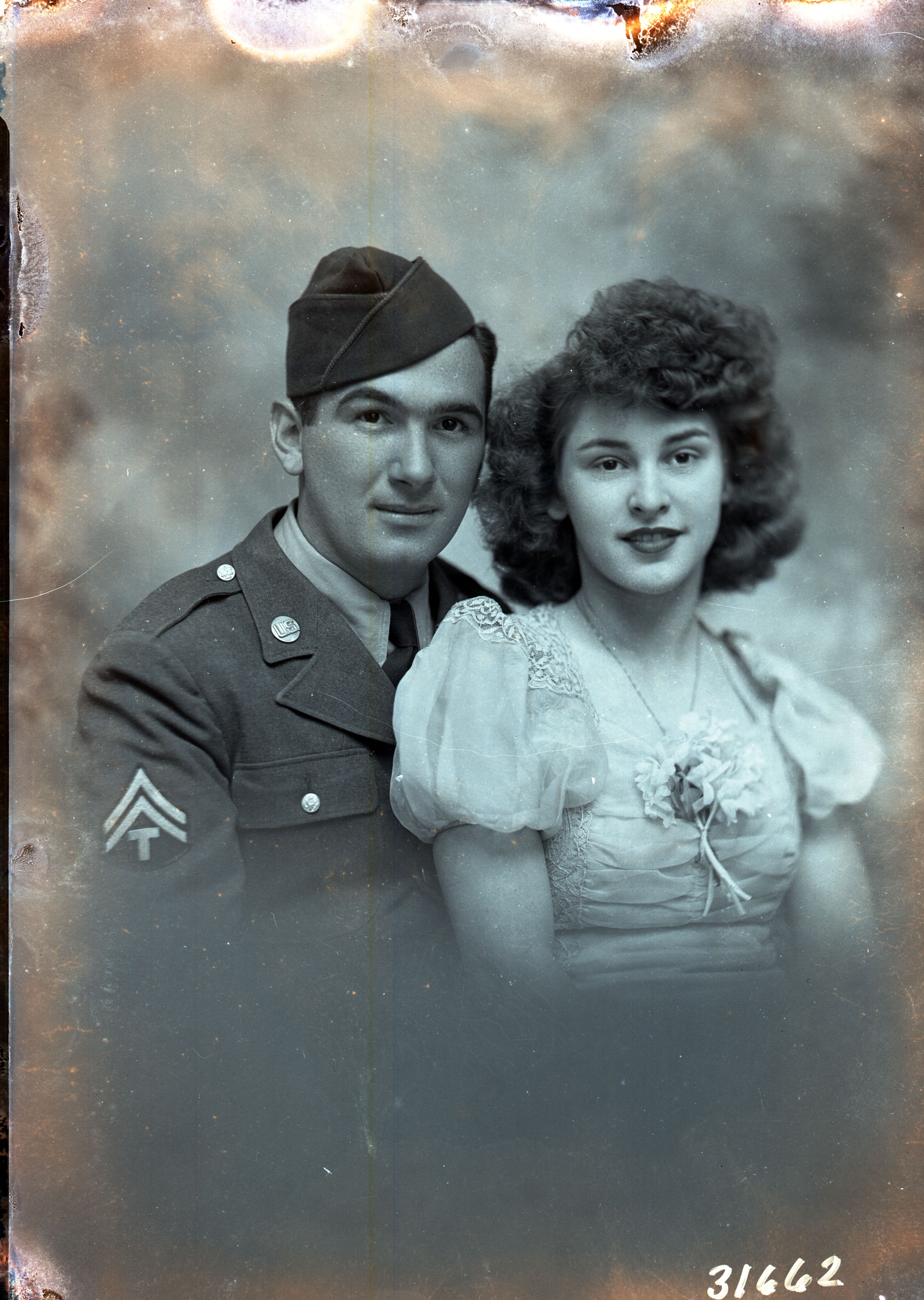 Portrait photograph of an unidentified young man in a U.S. Army uniform seated beside an unidentified young woman with curly hair and a corsage on the front of her dress.