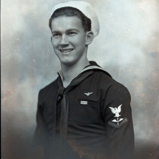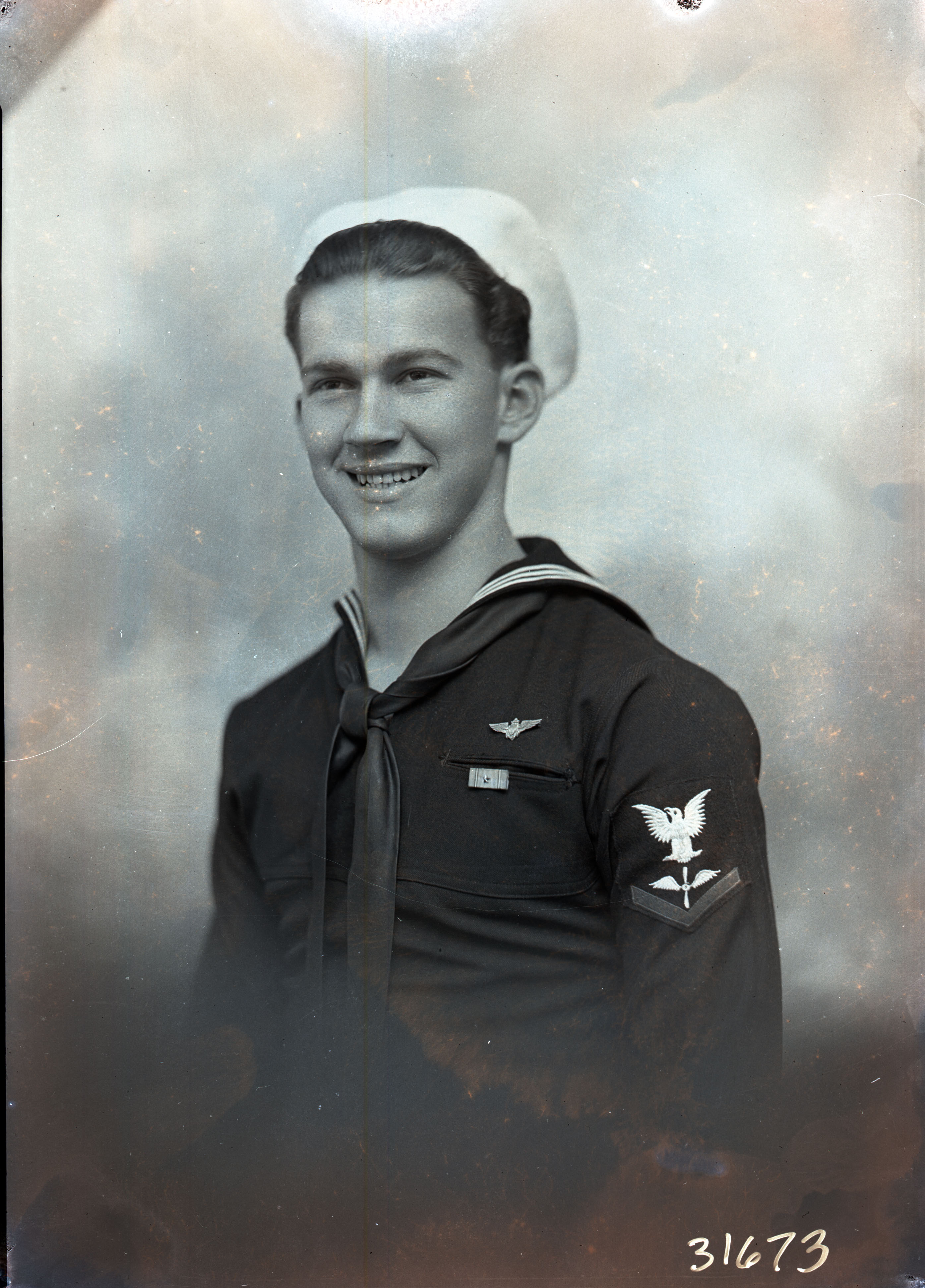 Portrait photograph of an unidentified young man wearing a U.S. Navy uniform and white cap.