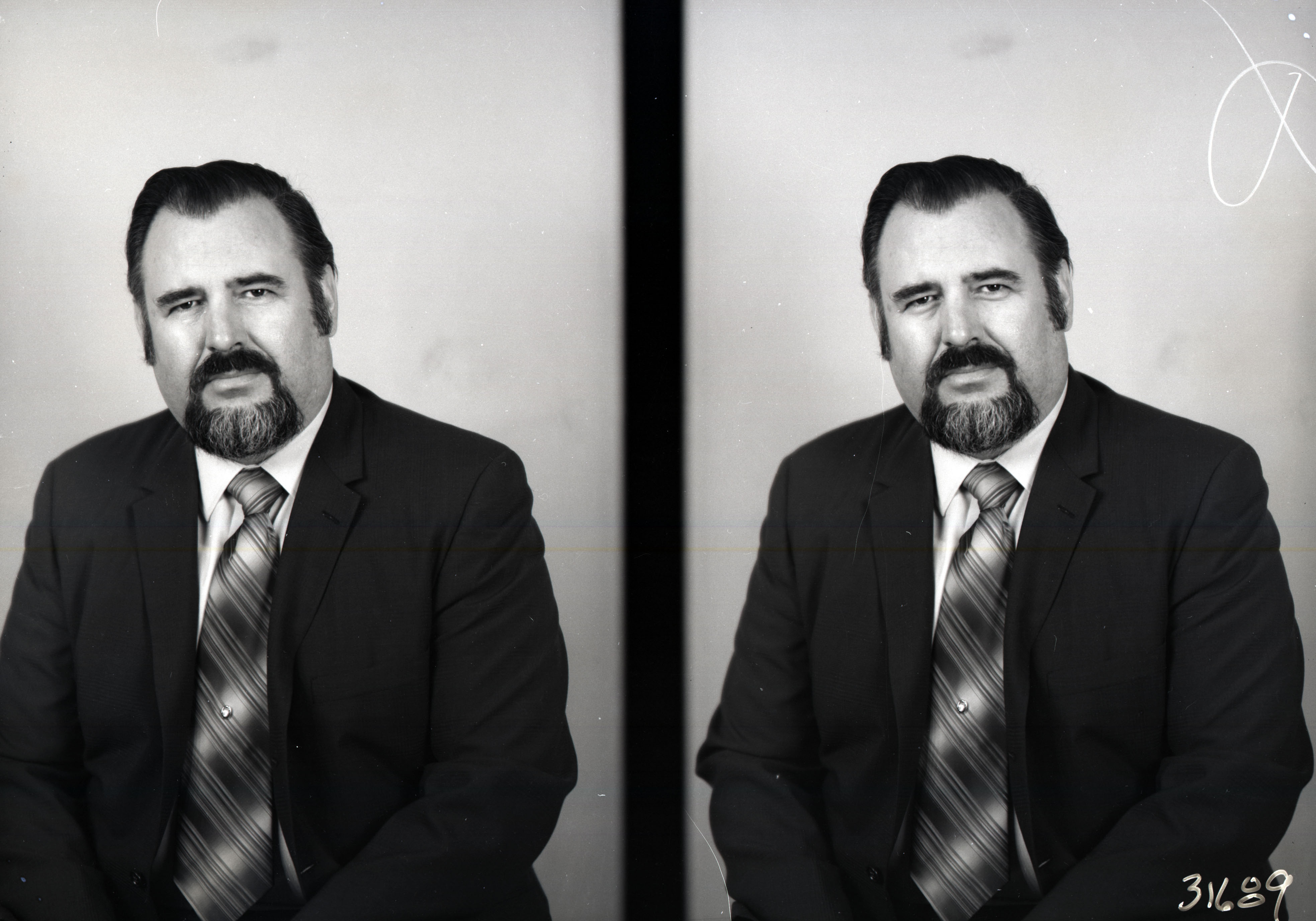 Photo of two separate portrait photographs of the same unidentified man with a mustache and beard. He is wearing a suit and striped tie.