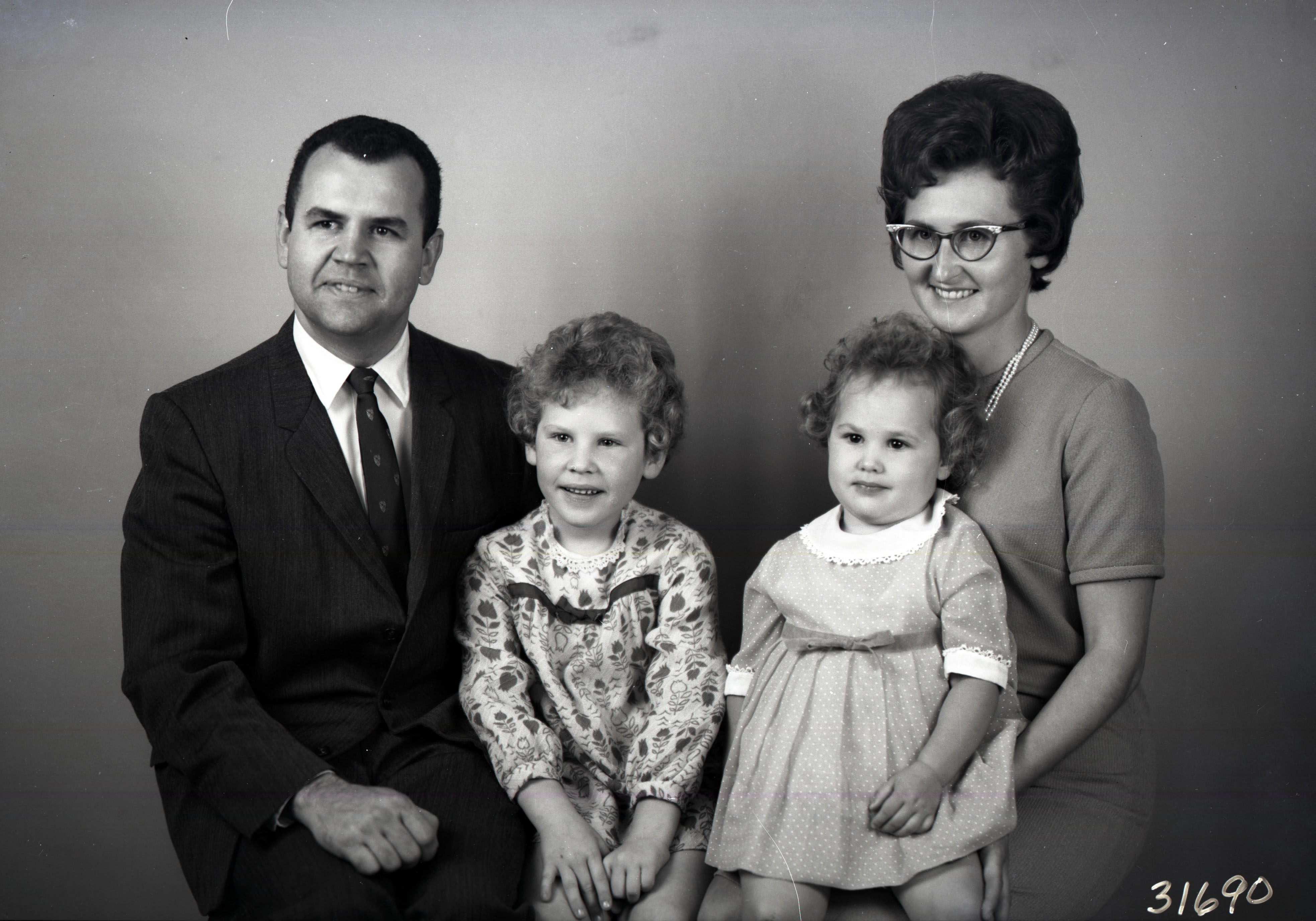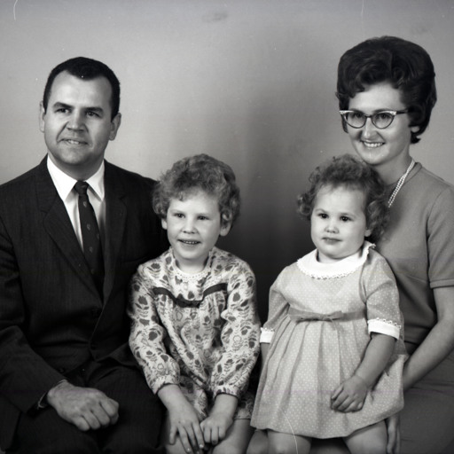Unidentified man and woman with glasses are seated together with two young unidentified children of different ages posed between them.