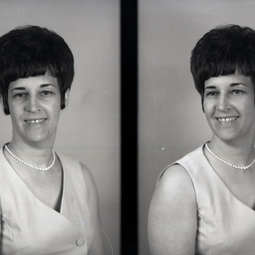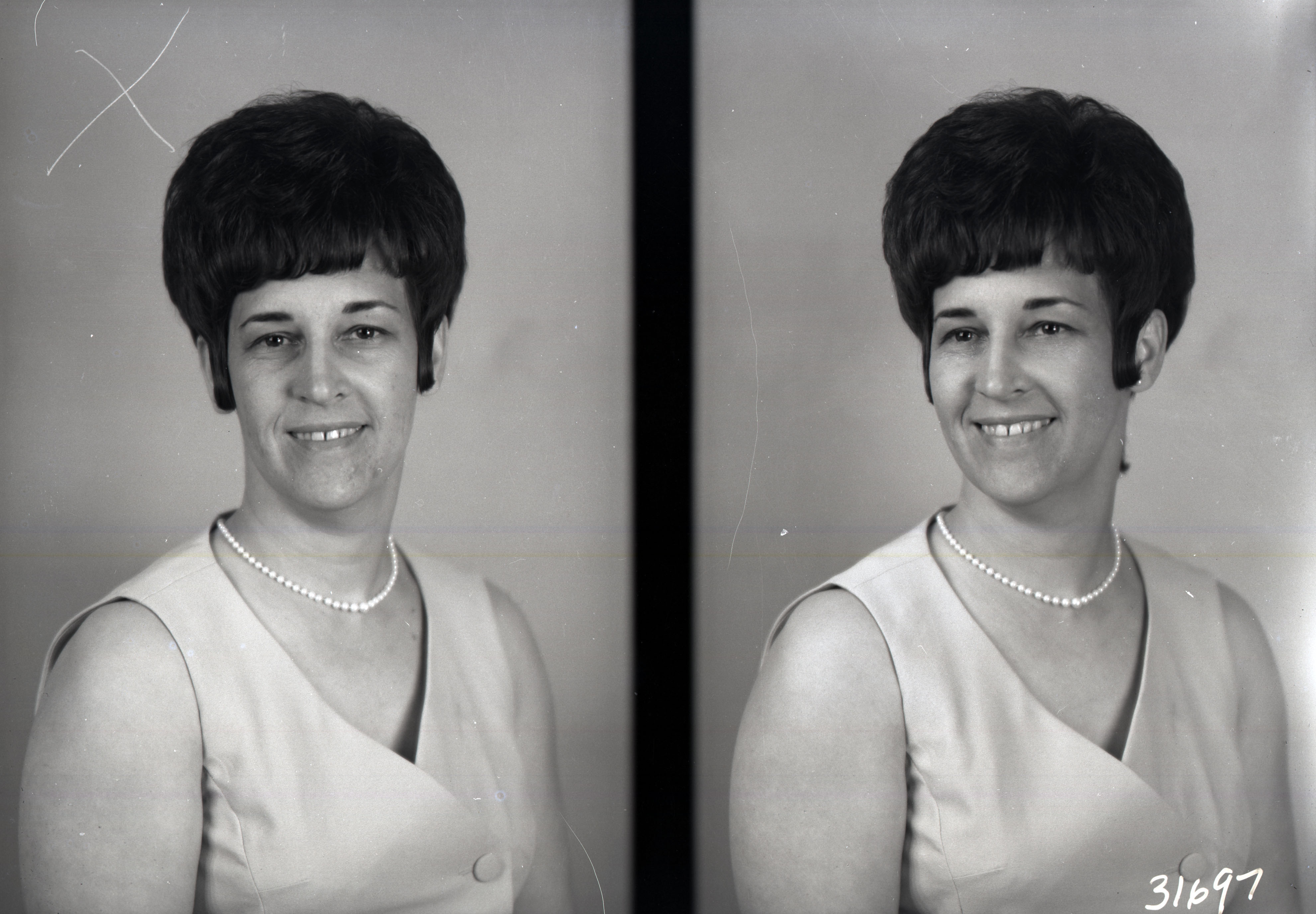 Photo of two separate portrait photographs of the same unidentified woman with short hair and wearing a bead necklace with her sleeveless dress.