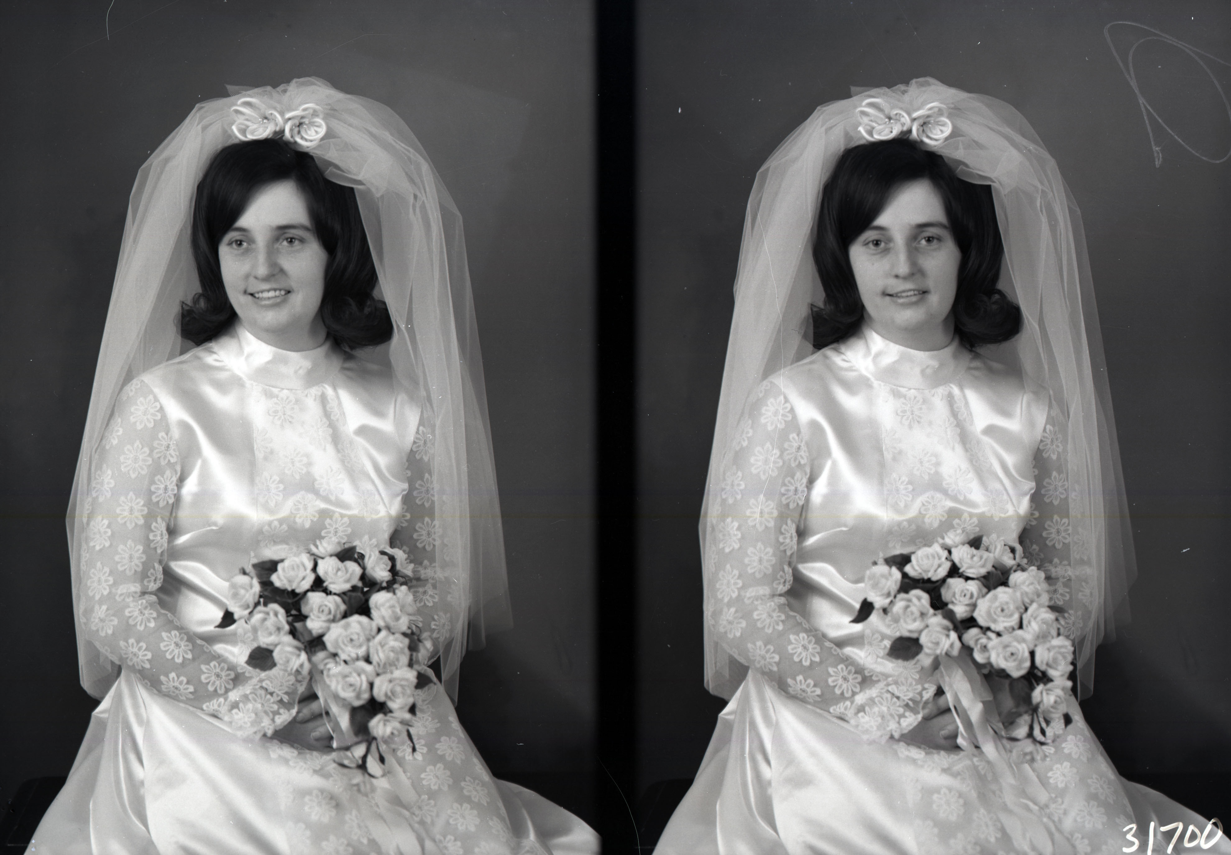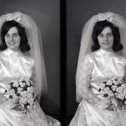 Photo of two separate photographs of an unidentified young bride in her wedding gown veil and bouquet.