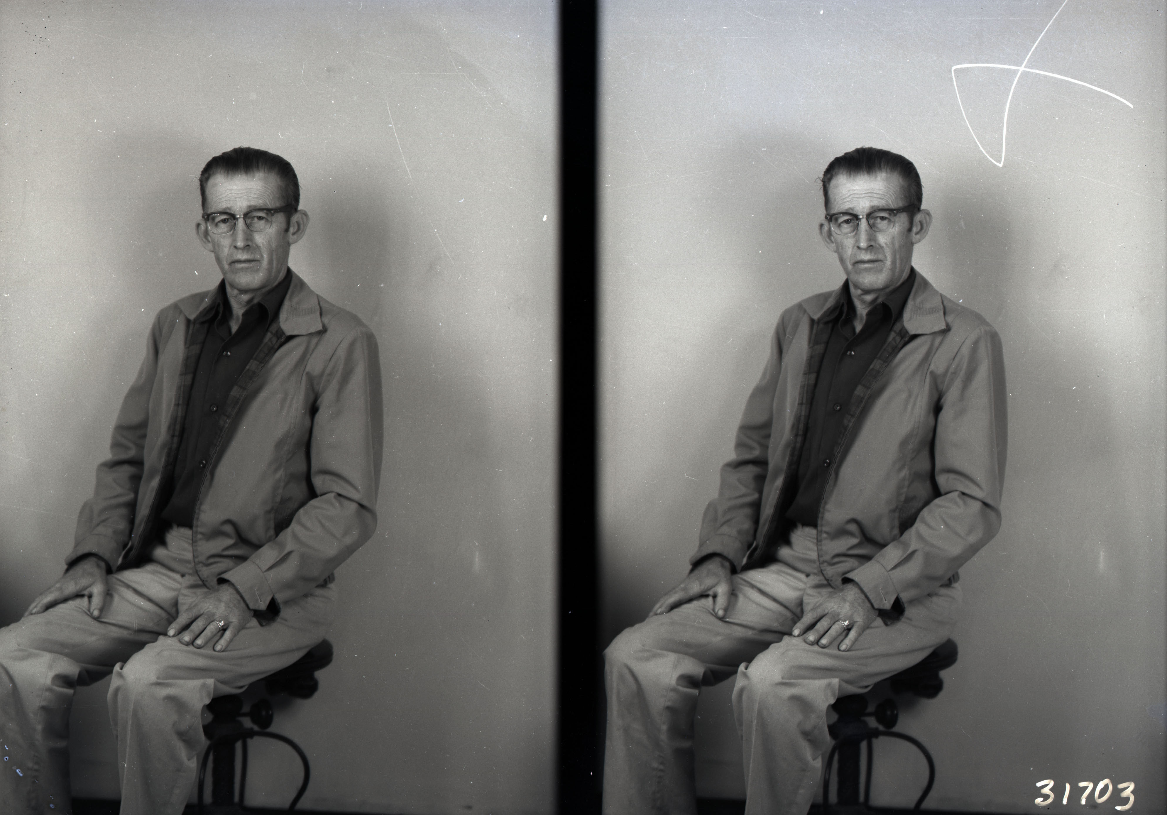 Photo of two separate photographs of the same unidentified man with glasses and wearing a jacket that zippers closed.