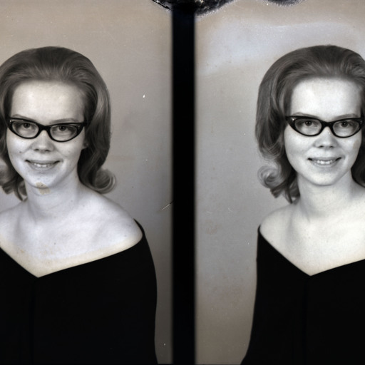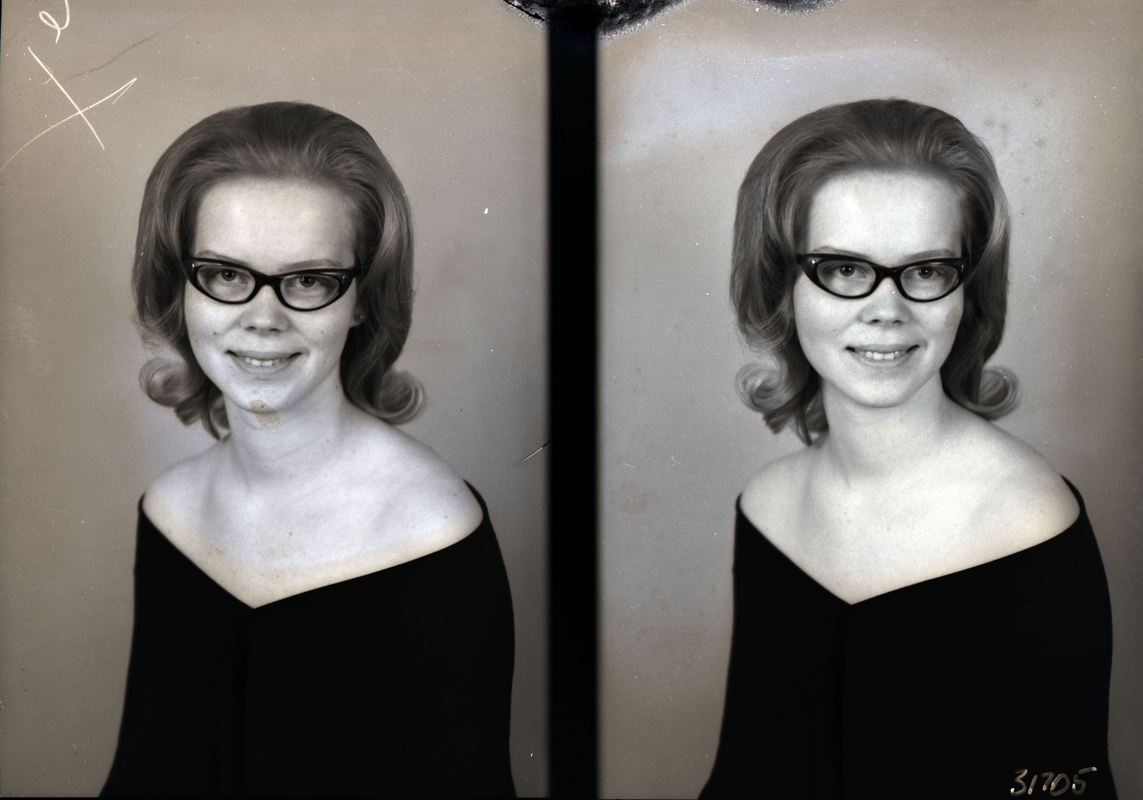 Photo of two separate portrait photographs of the same unidentified young woman with glasses and hair that is curled outwards at the bottom.
