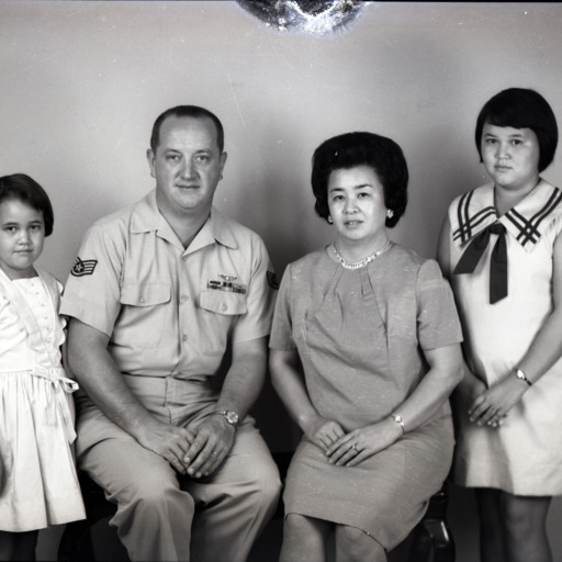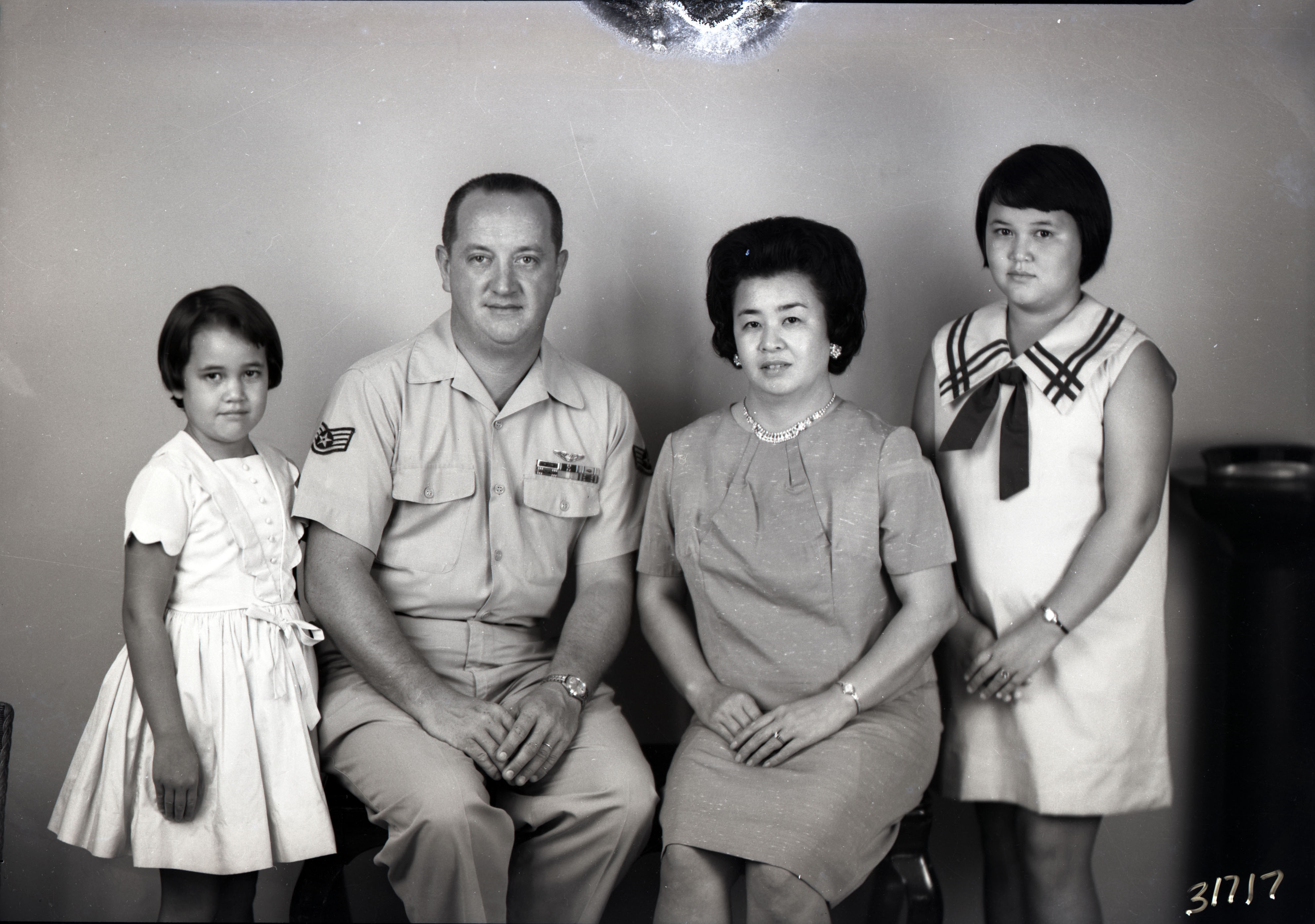 Leslie A. "Les" Seal in a U.S. Air Force uniform is seated beside his first wife, Susan Hiroko Veshima. They are flanked by their two daughters, Diana (left) and Deborah (right) Seal.