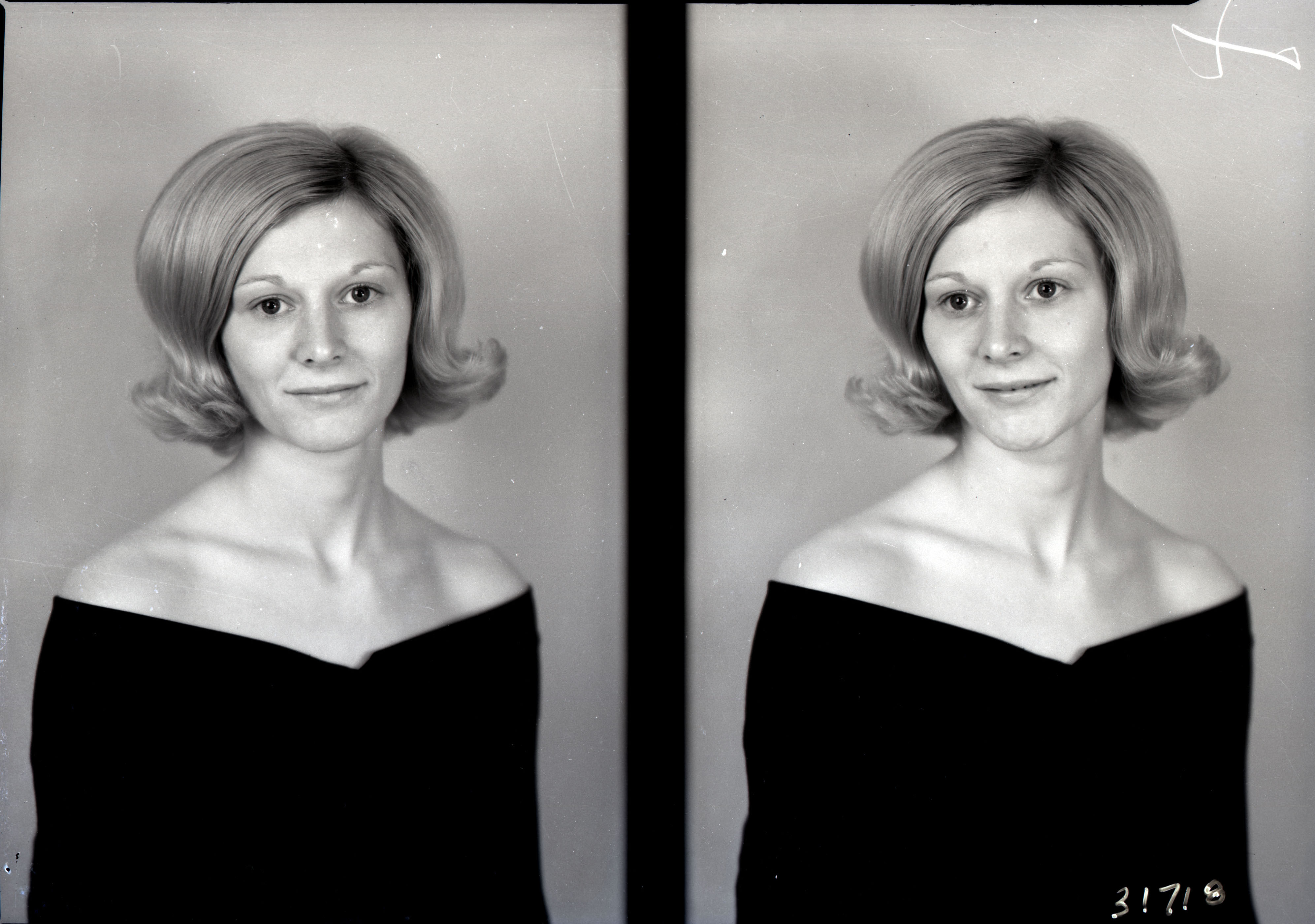 Photo of two separate portrait photographs of the same unidentified young woman with short straight hair curled outwards at the bottom and wearing a photographer's drape.