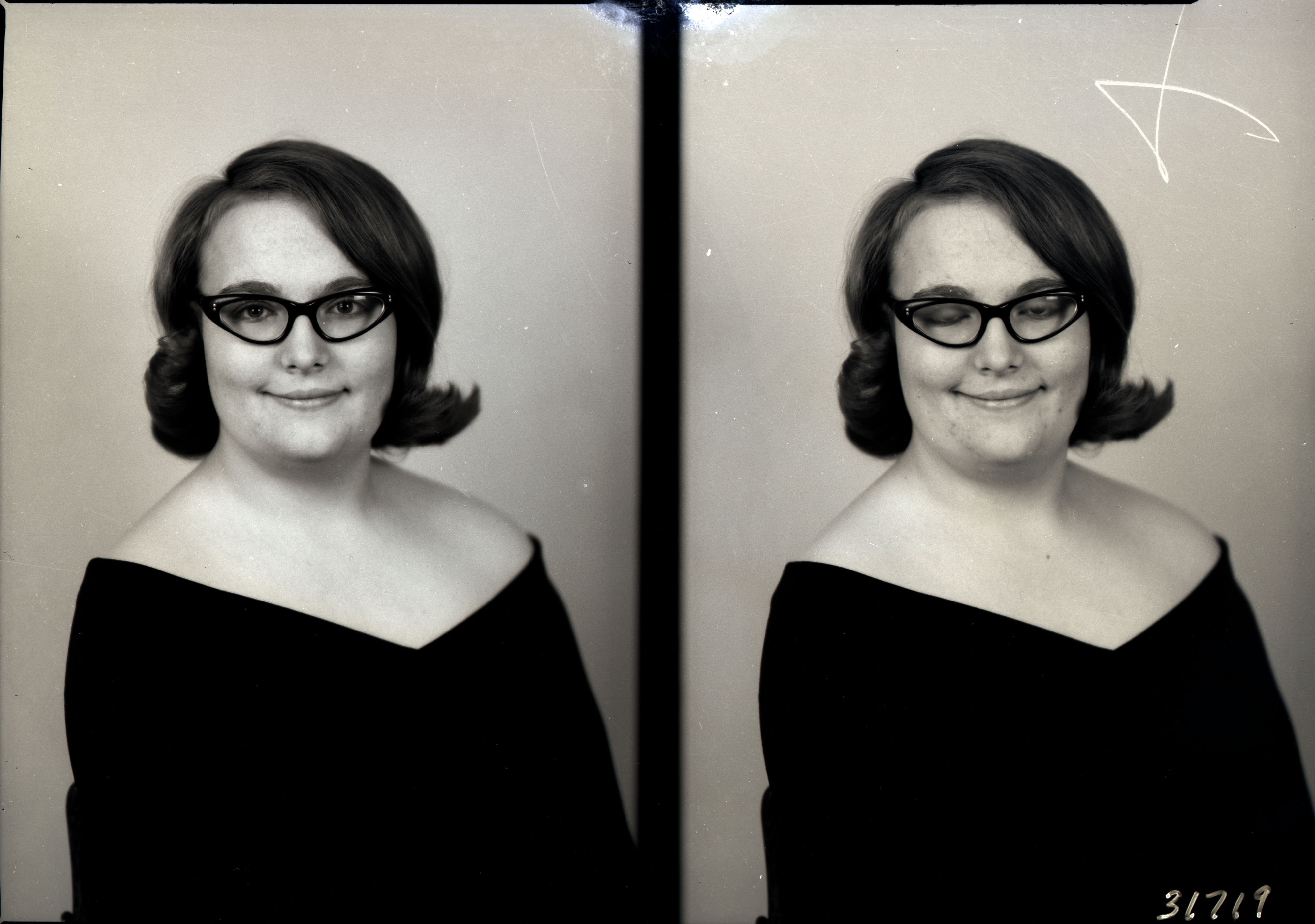 Photo of two separate portrait photographs of the same unidentified young woman with glasses and wearing a photographer's drape.
