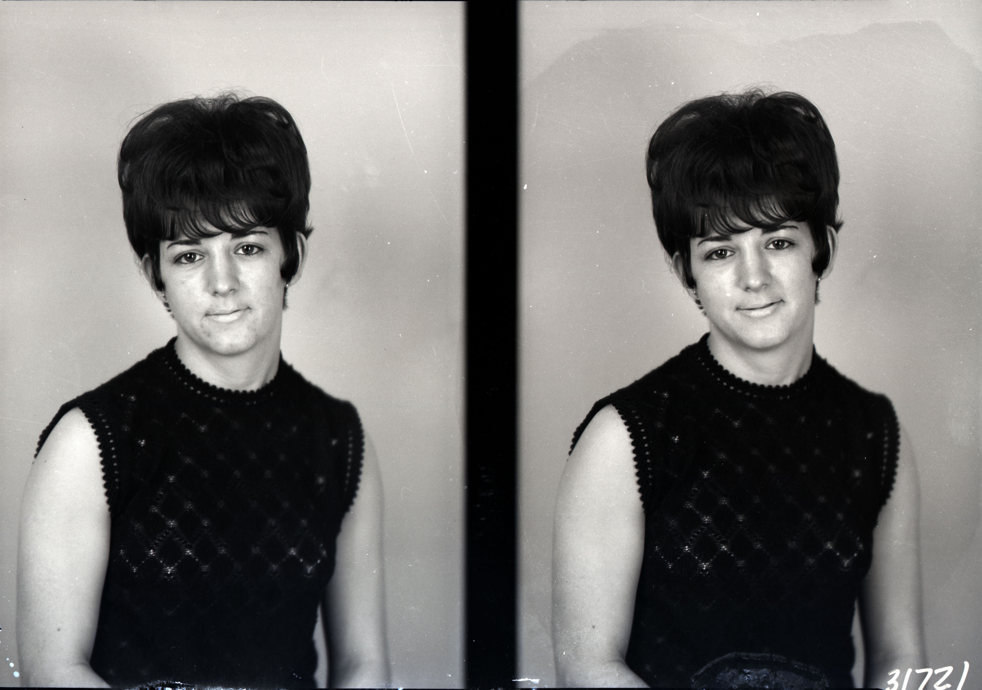 Two images of two separate portrait photographs of the same unidentified young woman with short hair and bangs.