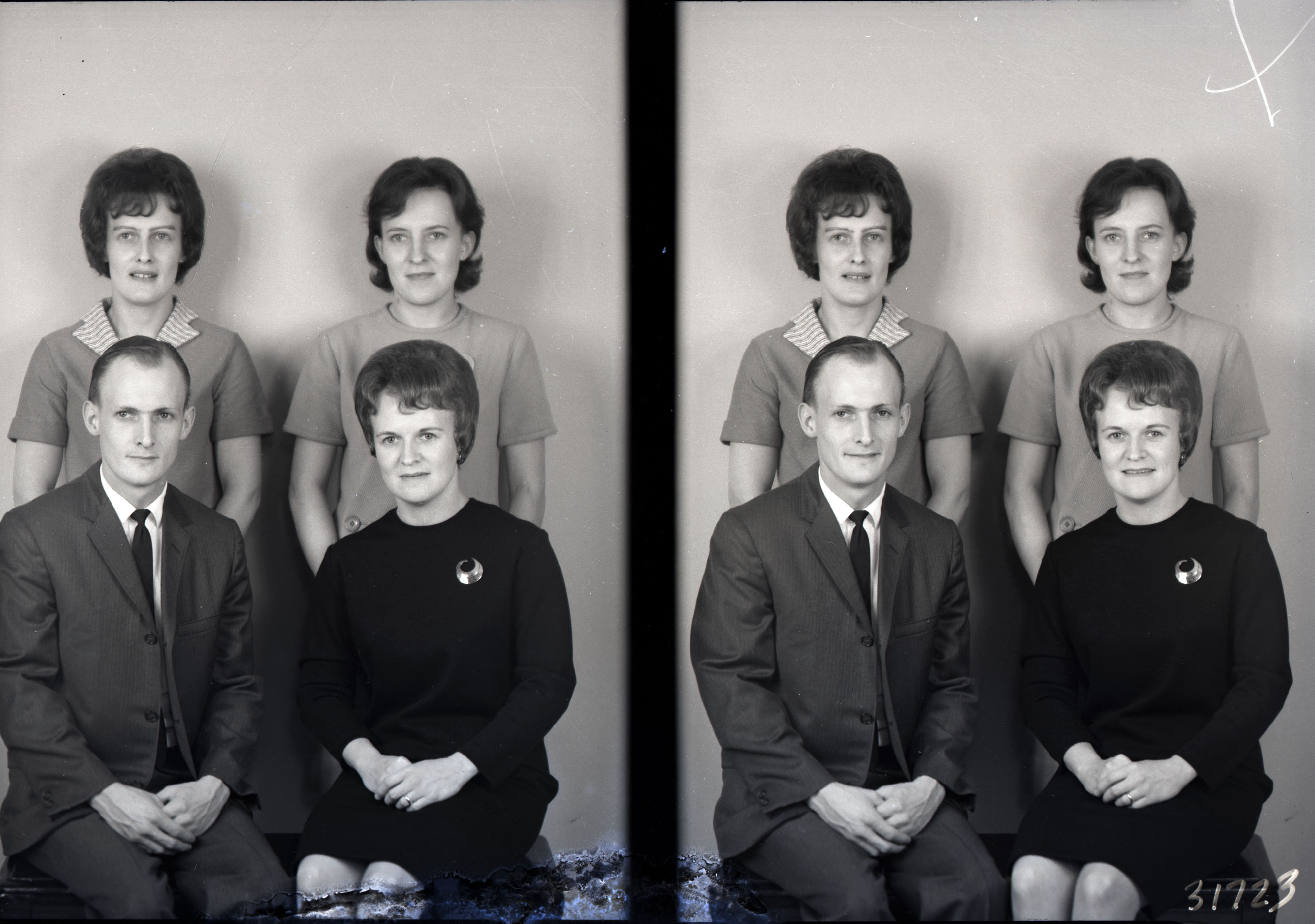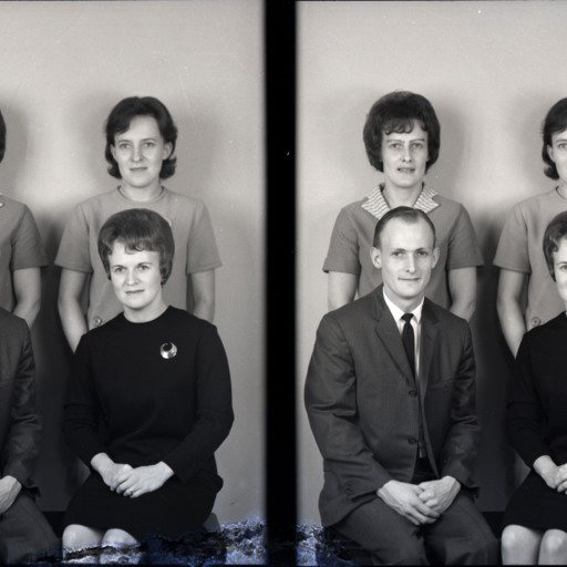 Photo of two separate photographs of the same four unidentified people, three women and a man, posed together.