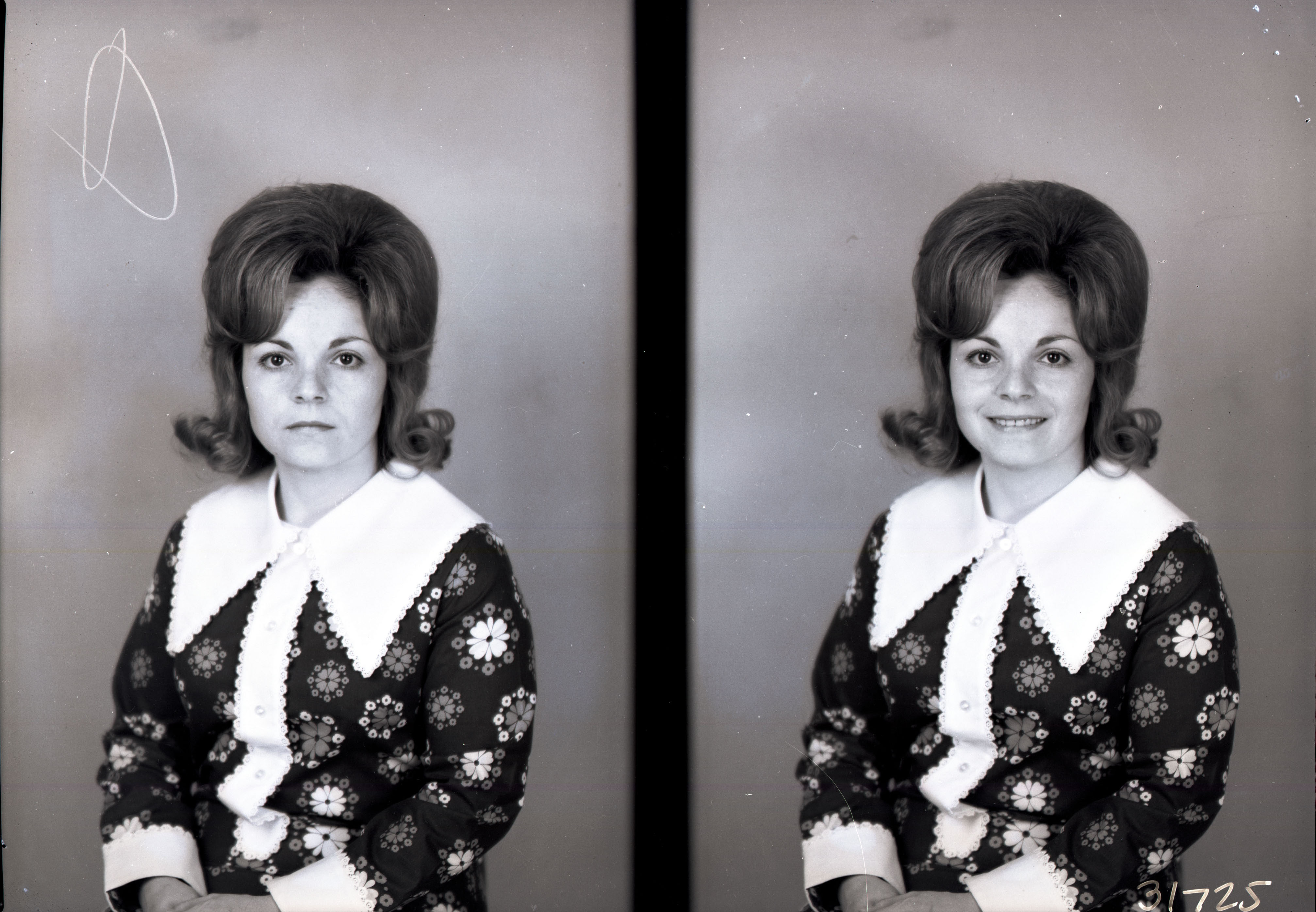 Photo of two separate portrait photographs of the same unidentified woman with styled hair curled outwards at the ends and wearing a print dress with a plain white collar and cuffs.