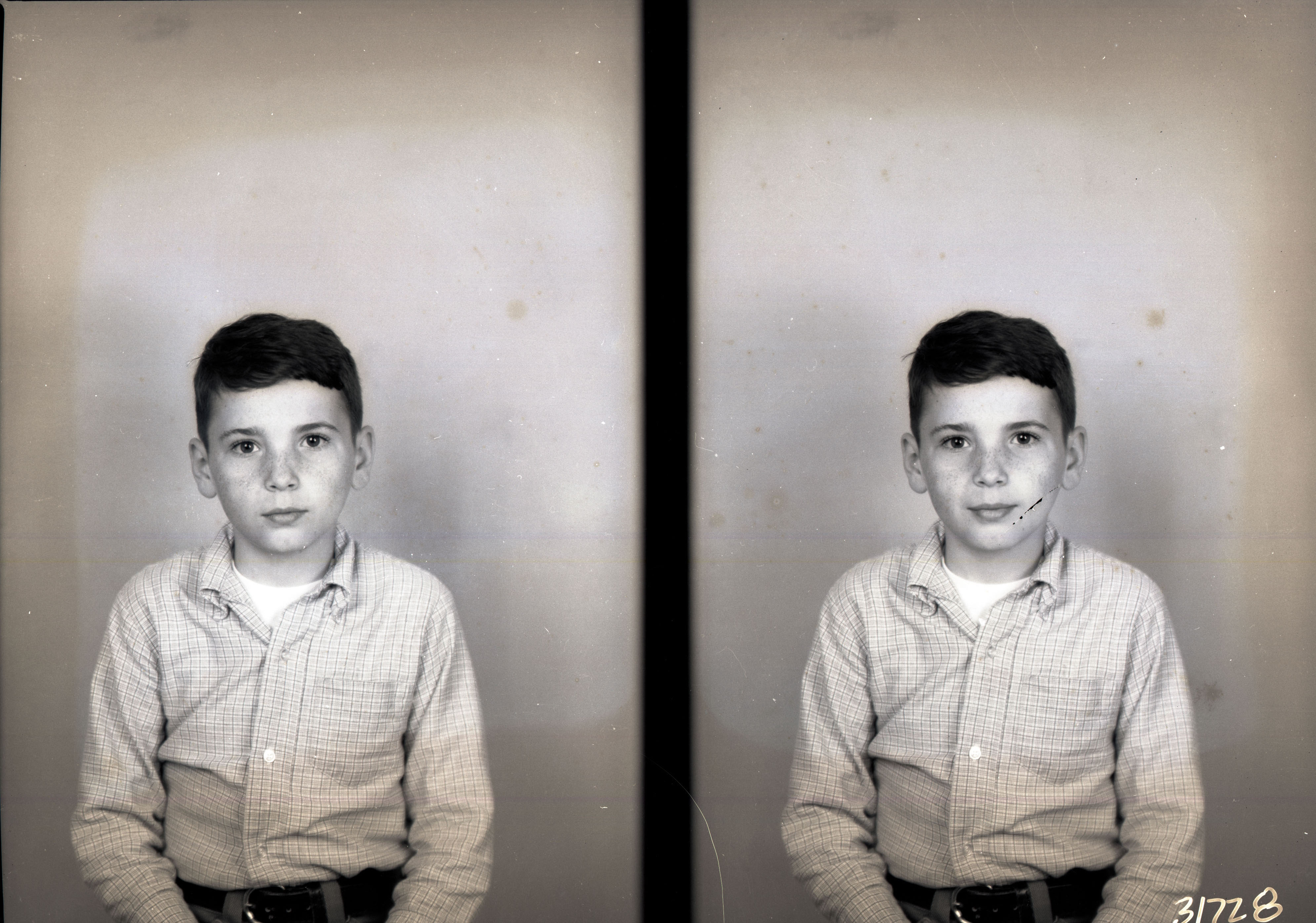 Photo of two separate portrait photographs of the same unidentified boy in a checkered shirt. The top button is not fastened and his undershirt is visible.
