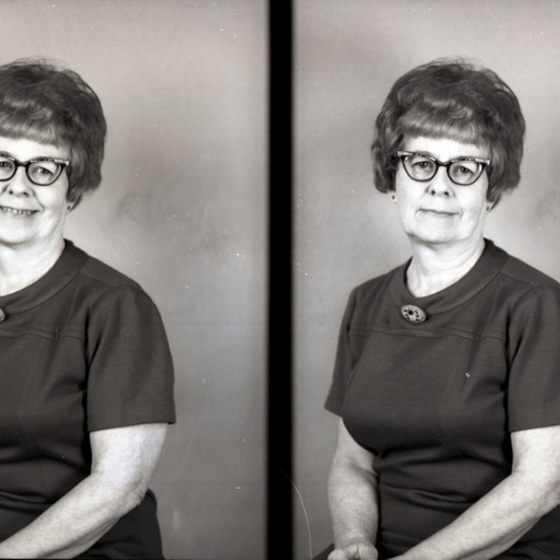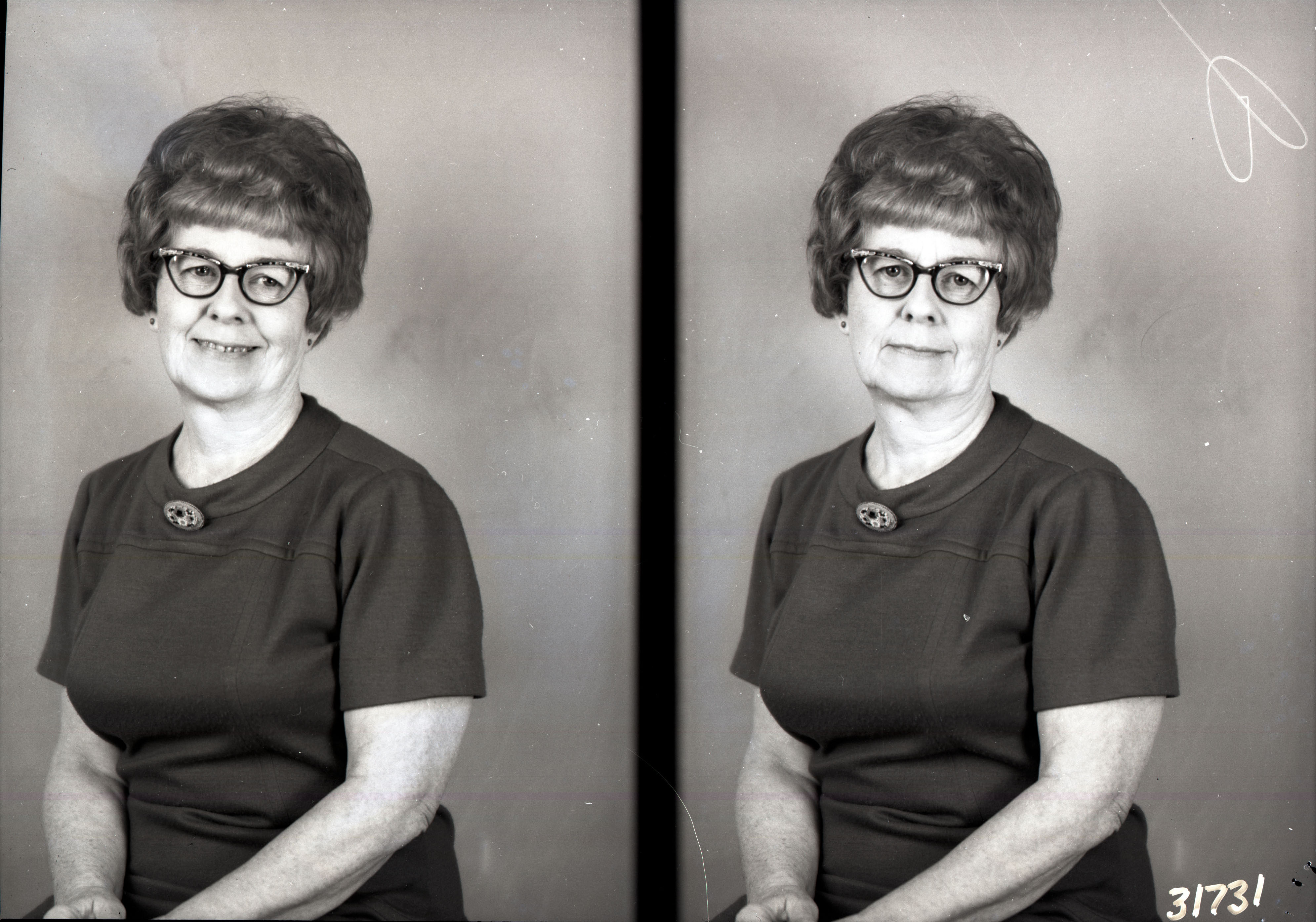 Photo of two separate portrait photographs of the same unidentified woman with short, styled hair, glasses and wearing a pin on the front of her short-sleeved dress.