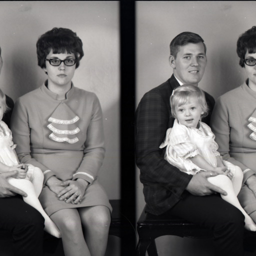 Photo of two separate photographs of the same unidentified man in a plaid jacket with a young girl on his lap and an unidentified woman with glasses seated beside him.