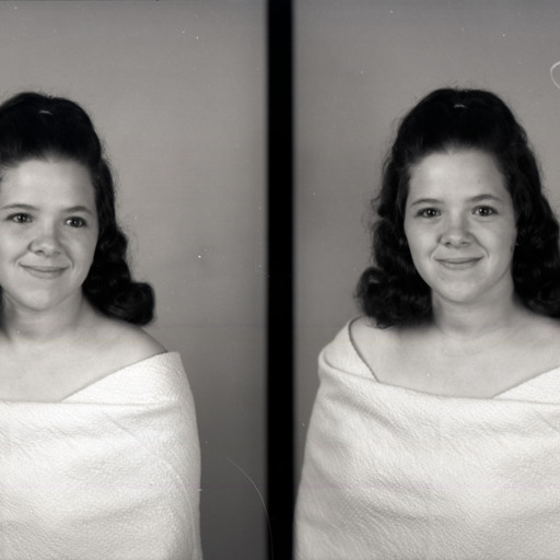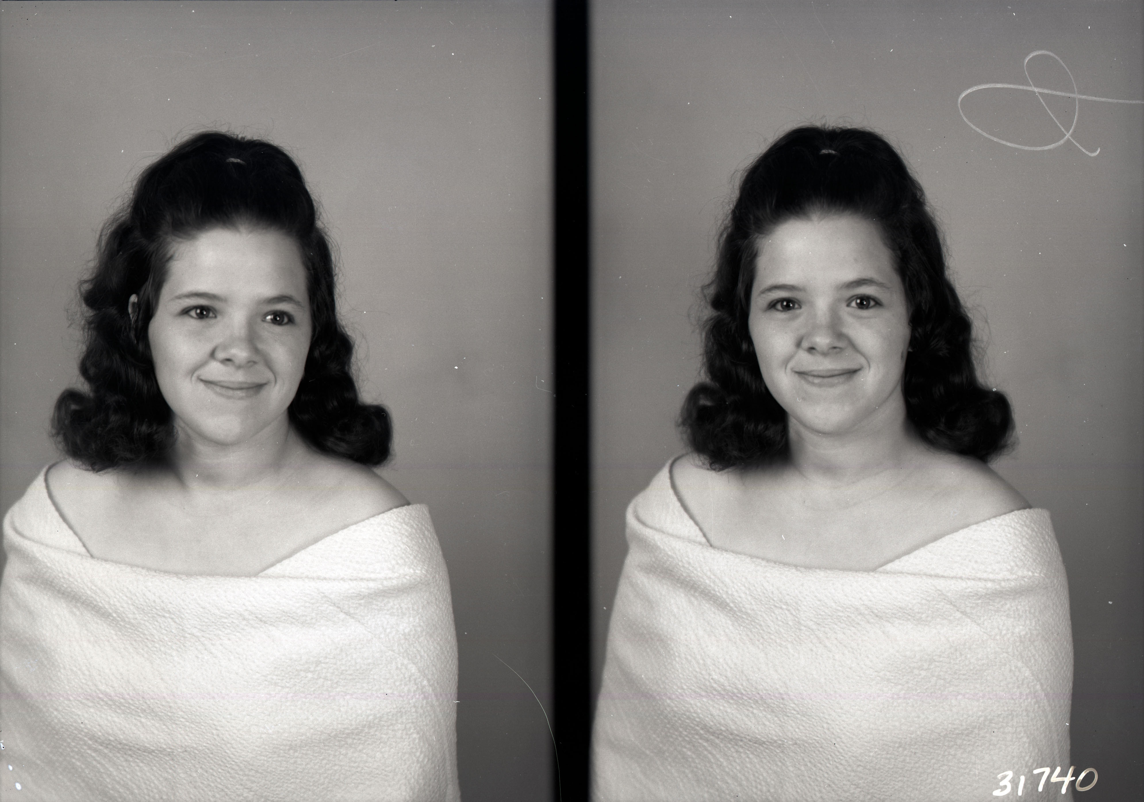 Photo of two separate portrait photographs of the same unidentified young woman with shoulder-length hair and wearing a photographer's drape.