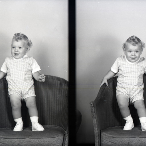 Photo of two separate photographs of the same unidentified young blond child standing on a wicker chair.