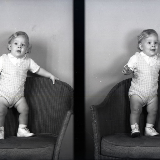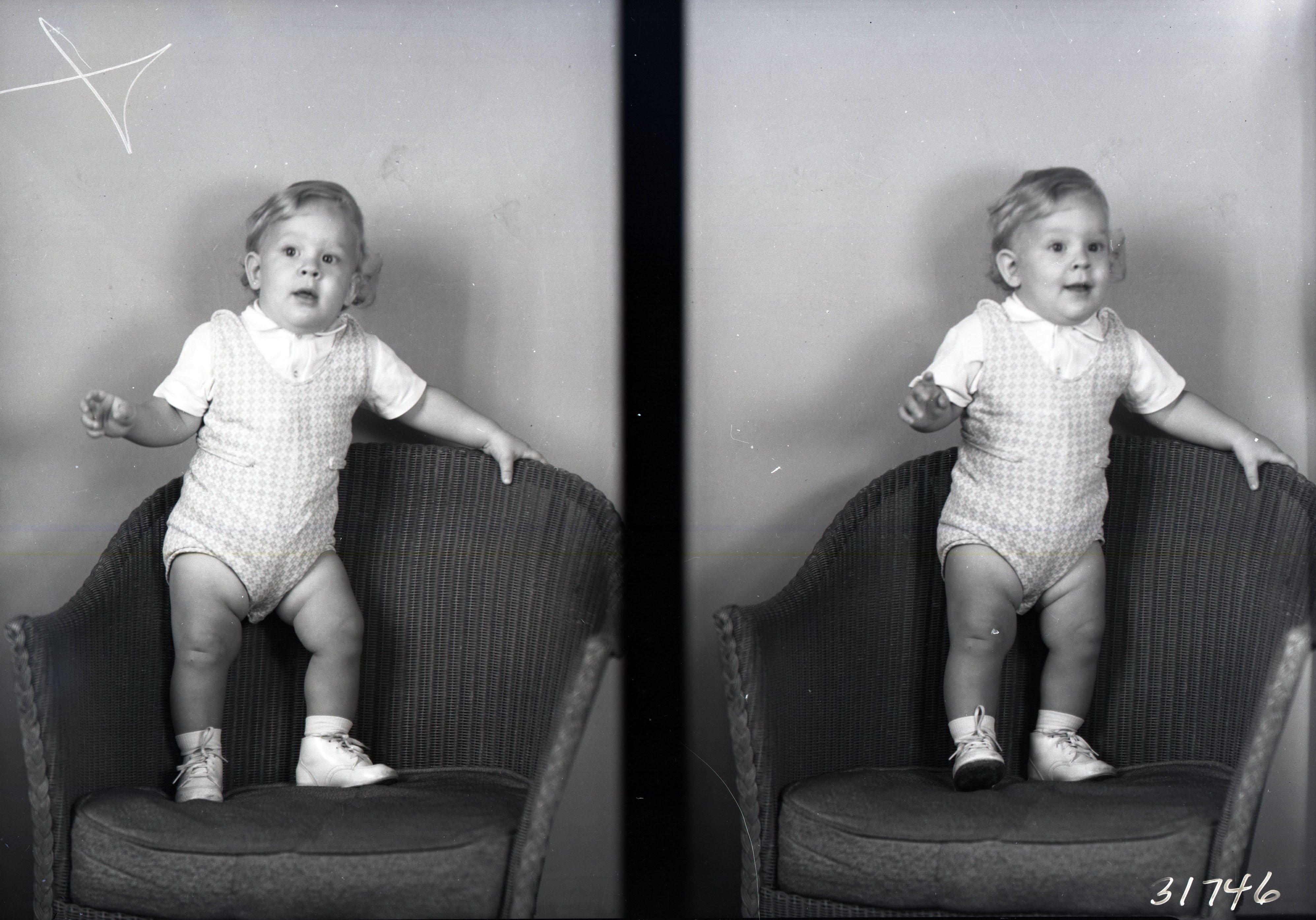 Photo of two separate photographs of the same unidentified young blond child standing on a wicker chair.