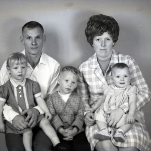 Unidentified young man and woman in a plaid outfit are seated together and holding three young children of different ages on their laps.
