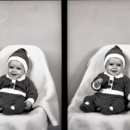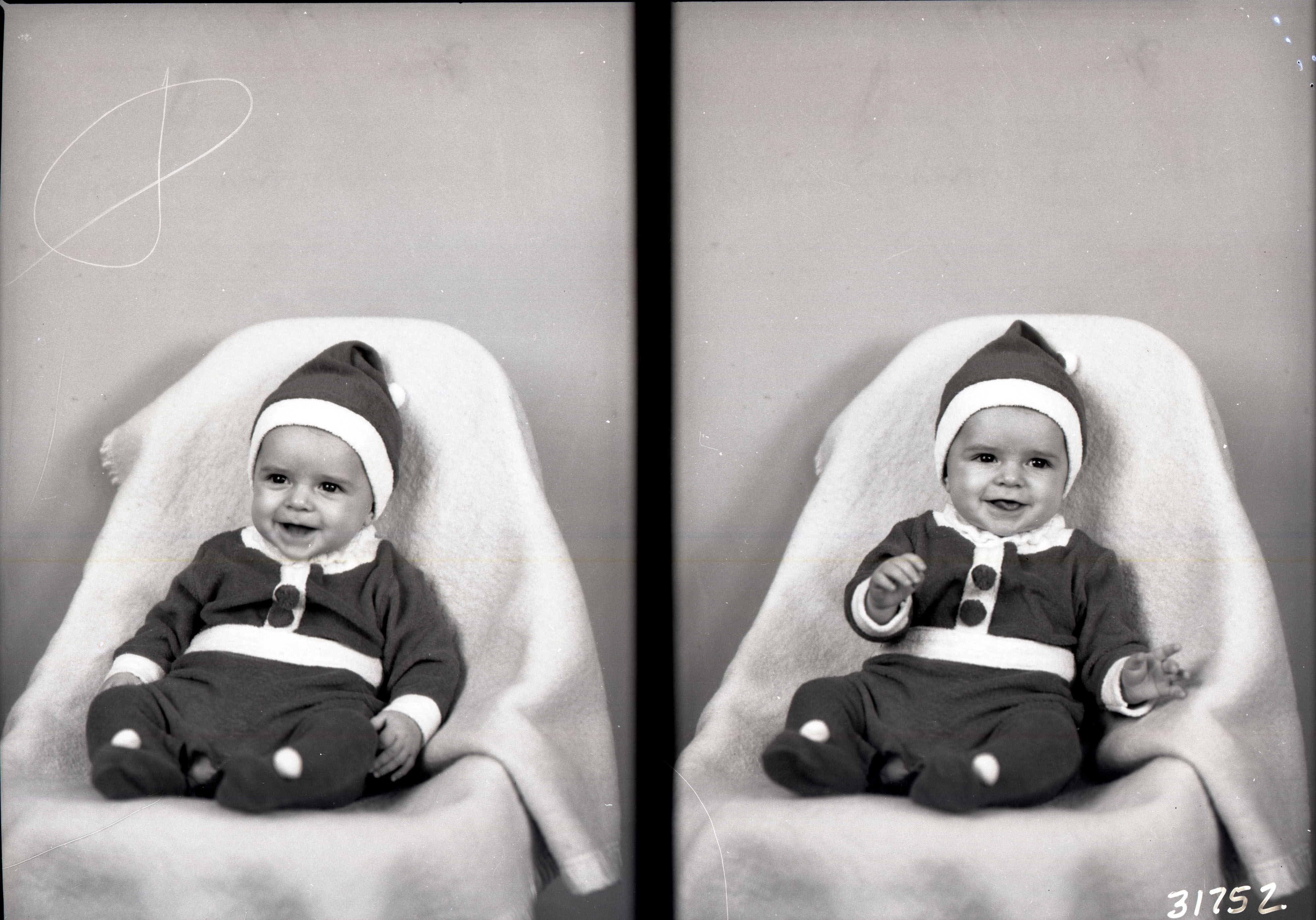 Photo of two separate photographs of the same unidentified young child dressed in a Christmas-themed suit with a stocking cap.