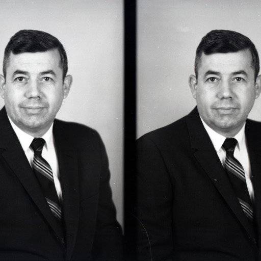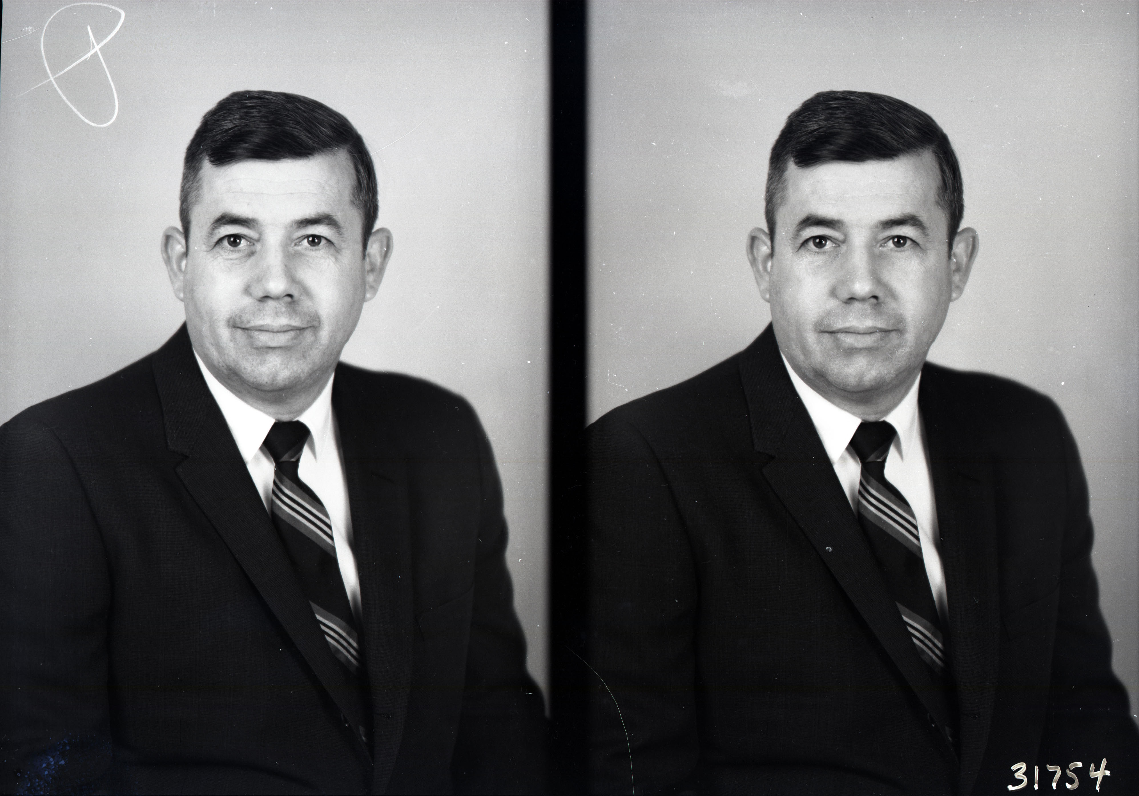 Photo of two separate portrait photographs of Warren B. French, Jr. in a suit and tie.
