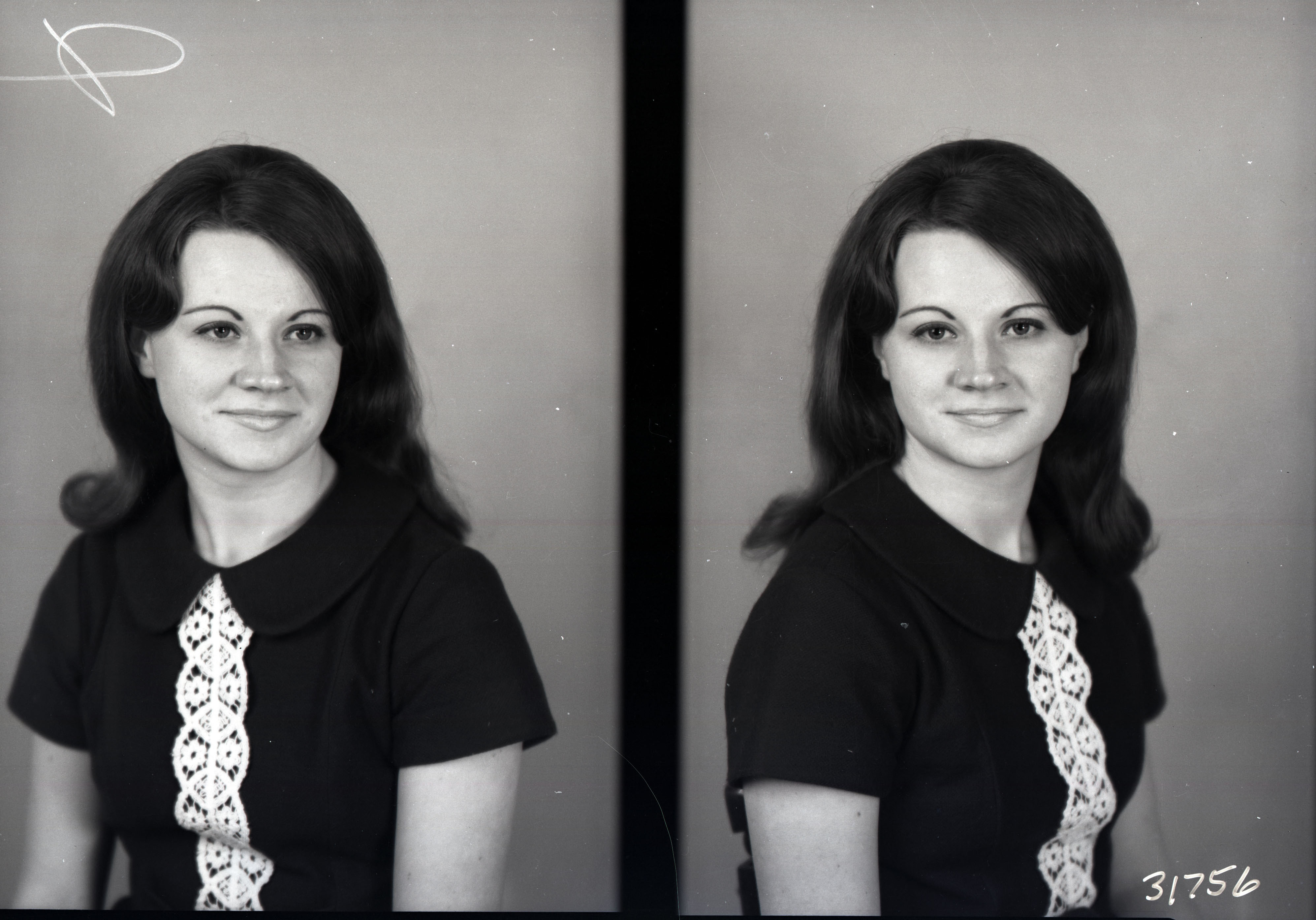 Photo of two separate portrait photographs of the same unidentified yung woman with long, dark hair and wearing a short-sleeved dress.