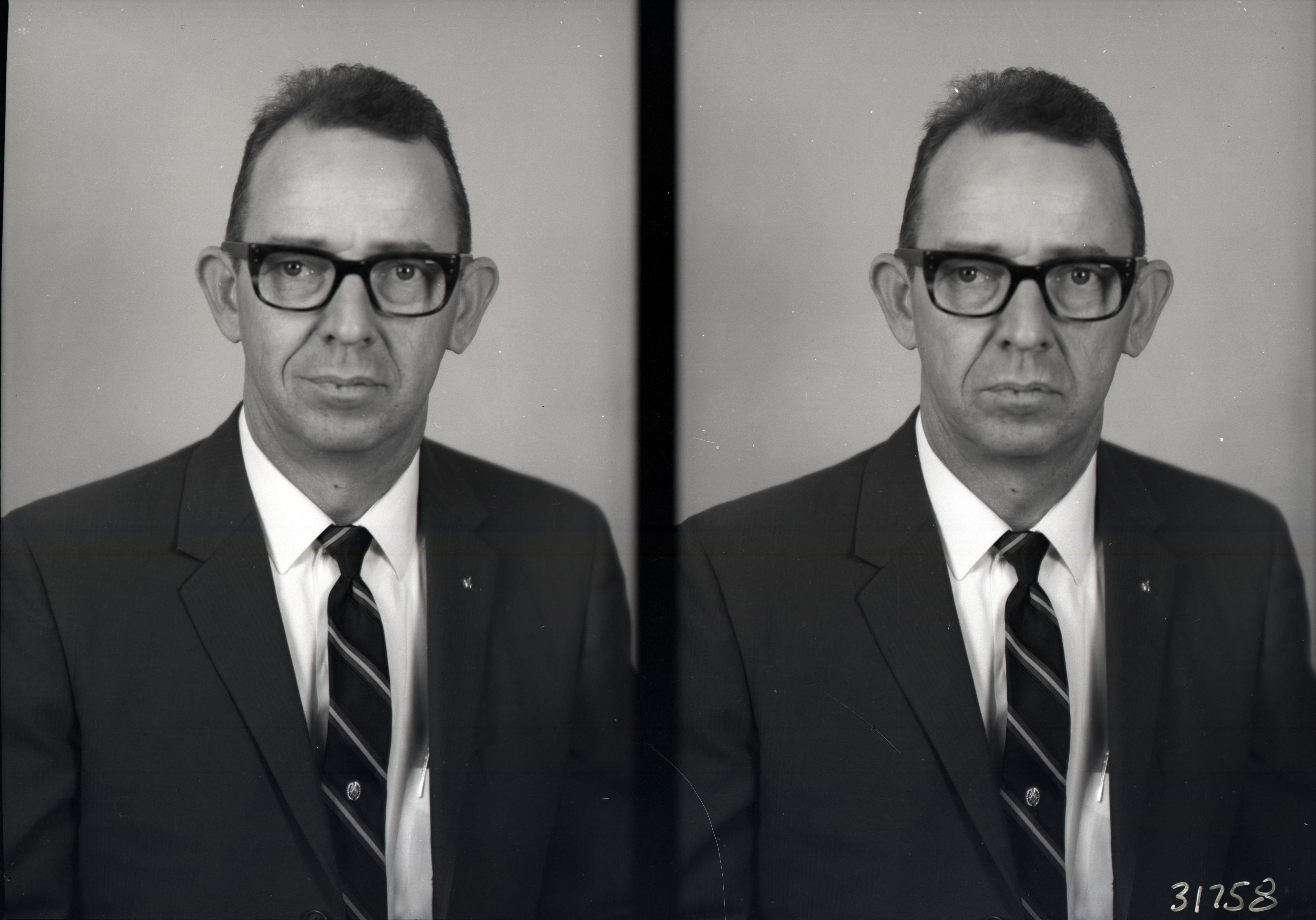 Photo of two separate portrait photographs of the same unidentified man with glasses and wearing a suit and striped tie with a pin on his lapel.