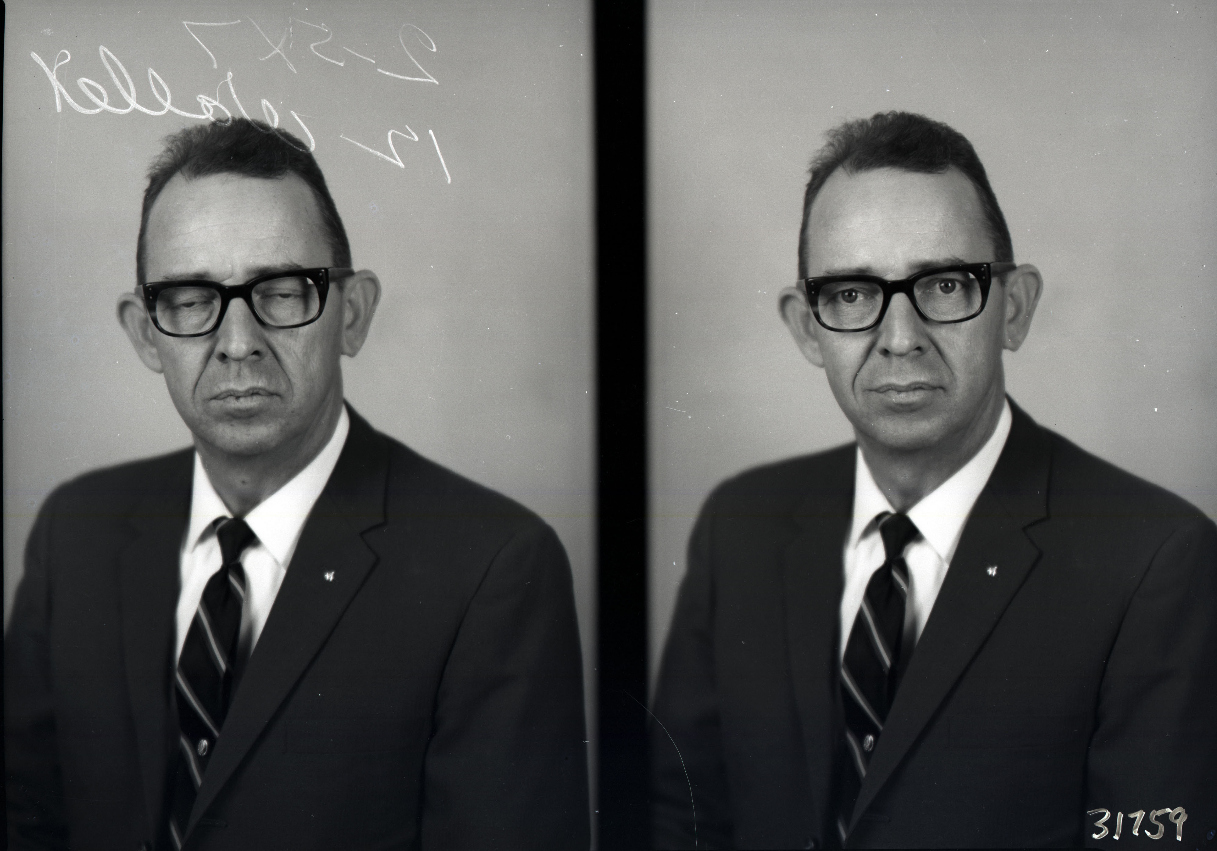 Photo of two separate portrait photographs of the same unidentified man with glasses and wearing a suit and striped tie with a pin on his lapel.