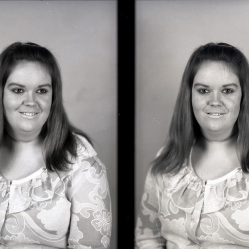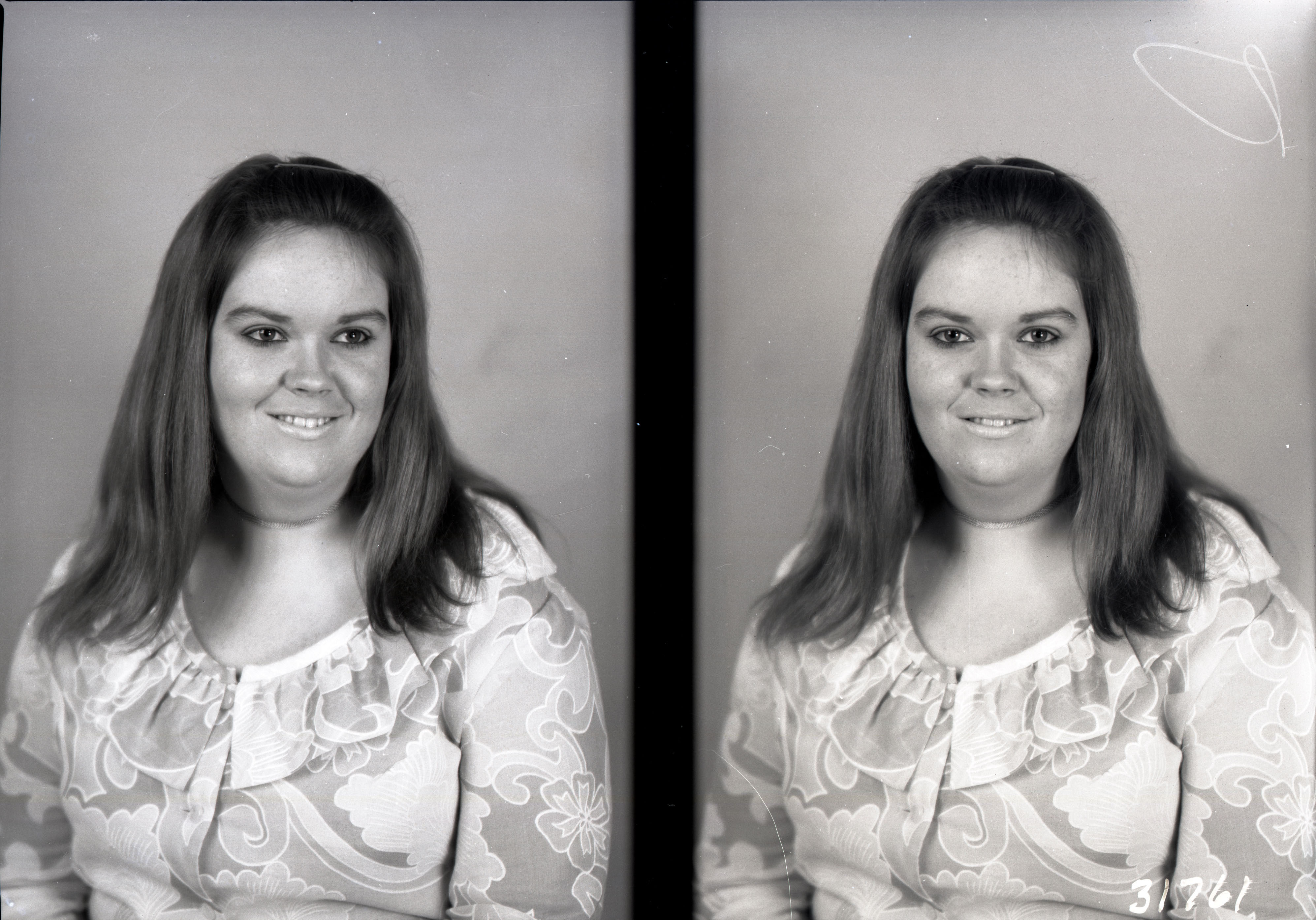 Photo of two separate portrait photographs of the same unidentified young woman with long, straight hair and wearing a print top.