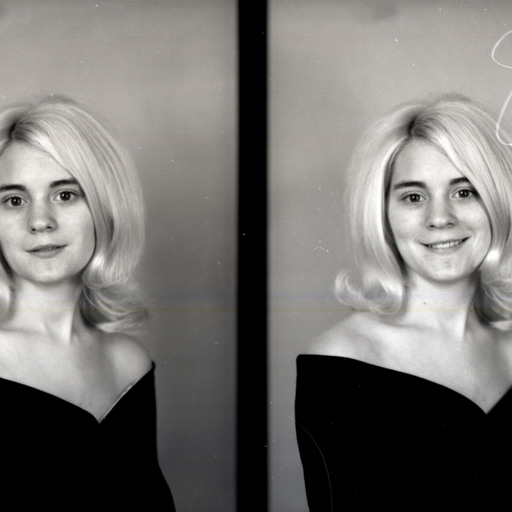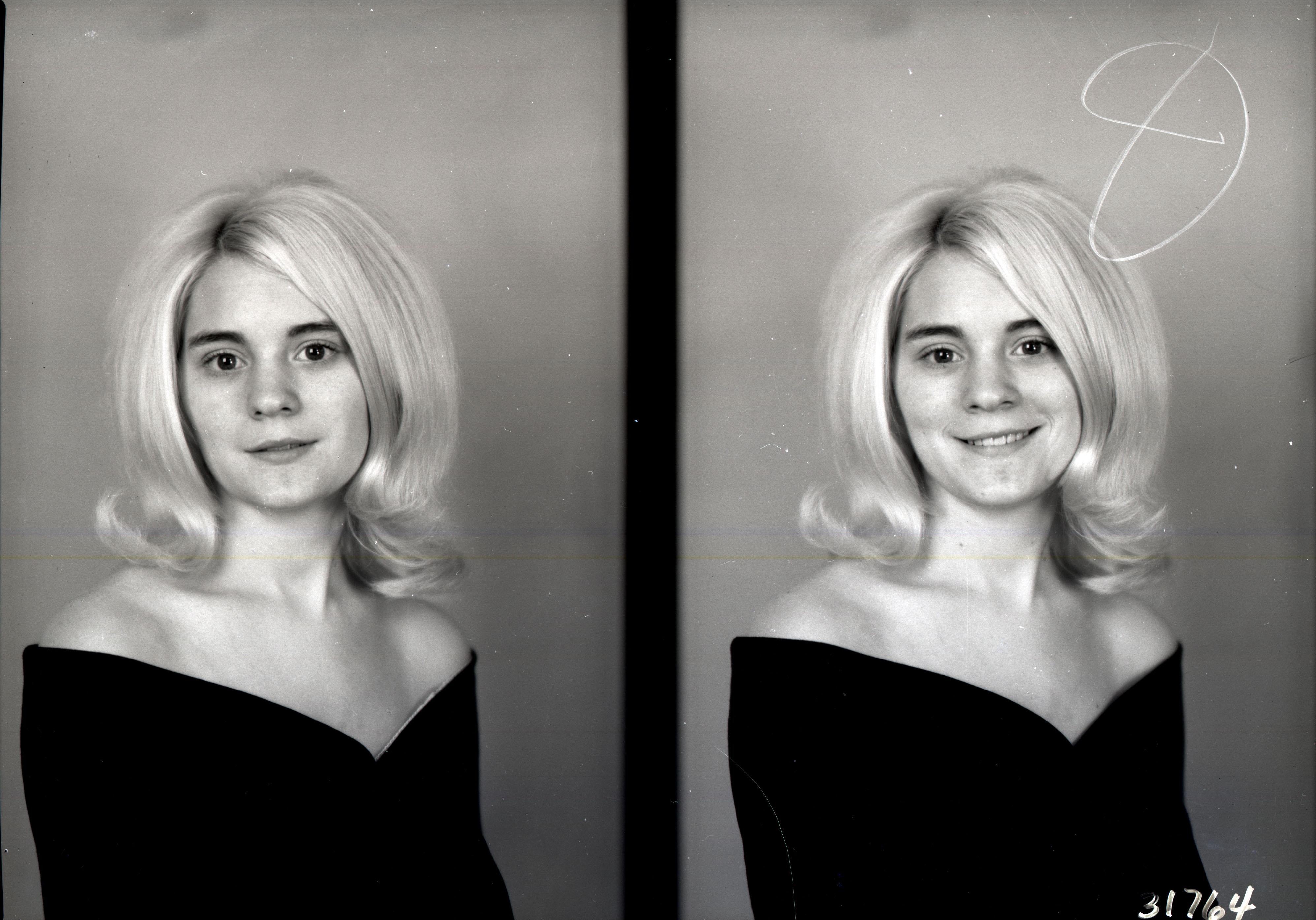 Photo of two portrait photographs of the same unidentified young woman with blond hair curled outwards and wearing a photographer's drape.